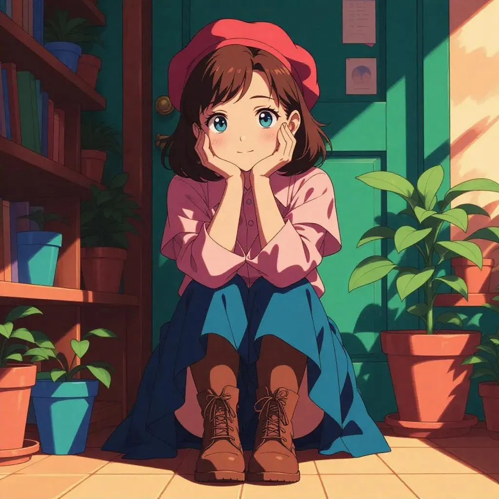 Create enchanting AI-generated images in Studio Ghibli style with vivago.ai. Capture Hayao Miyazaki's whimsical charm through flat shading, solid backgrounds, and detailed character designs. Perfect for nostalgic Studio Ghibli magic with cute, charming figures like a beret-wearing woman in boots and pink shirt.