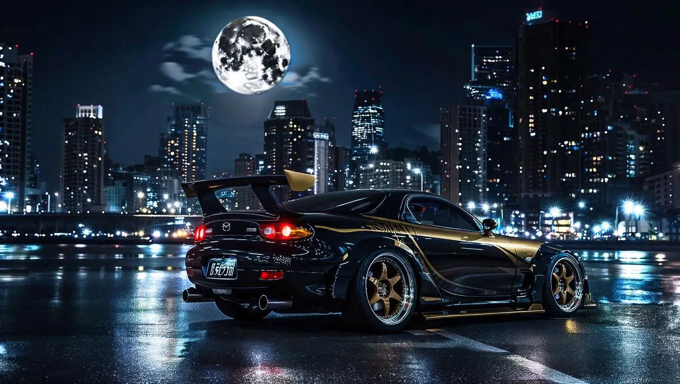 Stunning AI-generated image of a black MAZDA RX-Z with sleek spoiler, gold & diamond accents, glowing in a moonlit deserted metropolis. Futuristic cityscape backdrop, empty streets, and towering skyscrapers evoke mystery, intrigue, and futuristic allure. Create captivating AI visuals with VivaGo's advanced tools for hyper-realistic automotive and urban scene generation.
