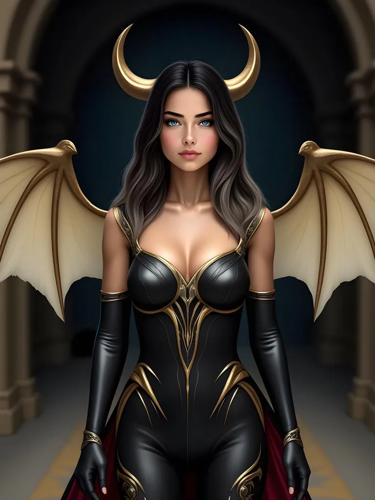A young woman with long dark hair and blue eyes gazes straight at the camera. She wears a black sleeveless top with a deep neckline. The lighting highlights her features, creating gentle shadows on her face. She appears to be indoors, as suggested by the plain, light-colored wall behind her. Her posture is relaxed, and her expression is neutral.