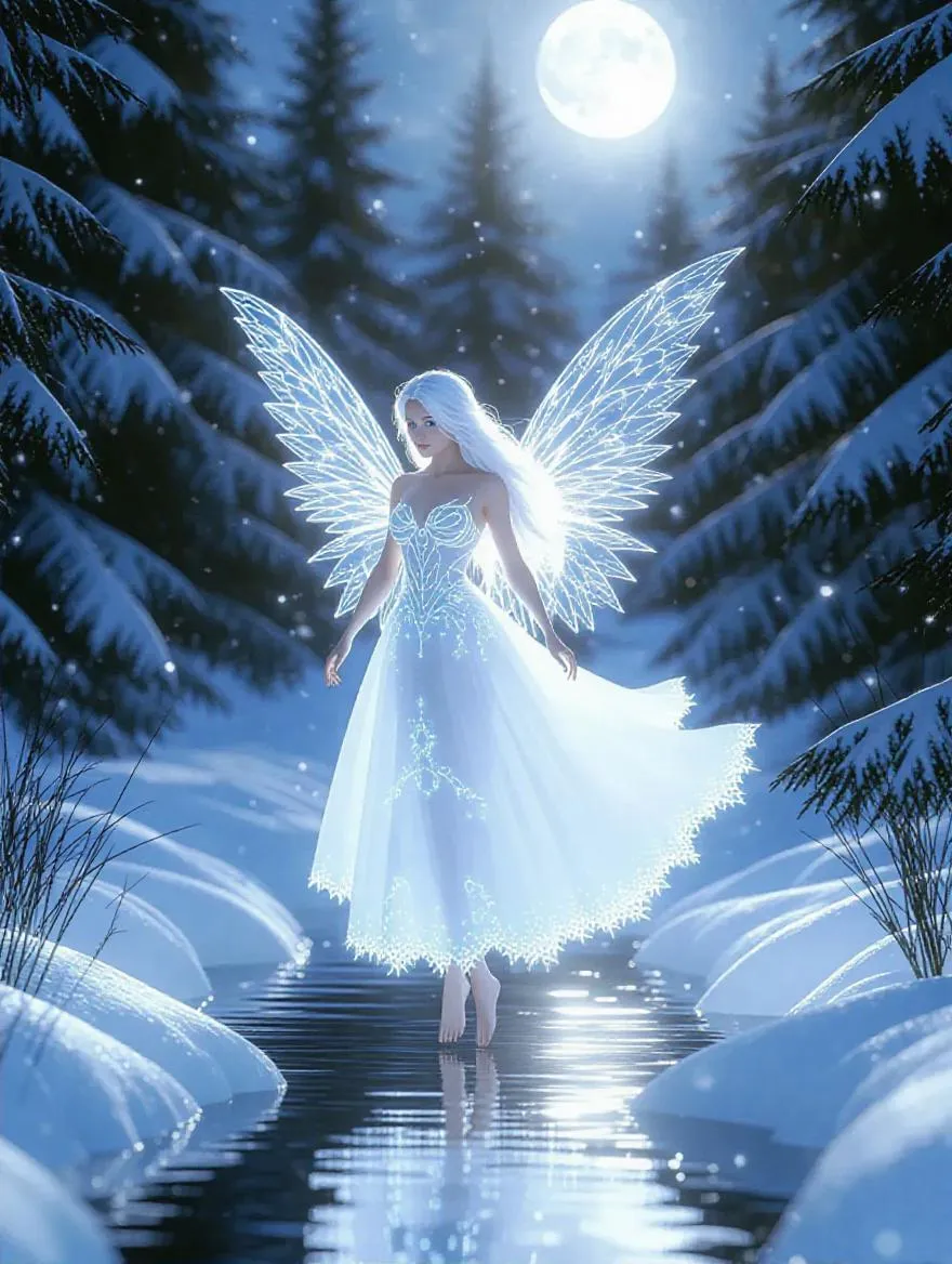 A luminous snow fairy descends gracefully into a moonlit pine forest during a full moon snowfall. Her translucent alabaster skin glows with bioluminescent patterns, crystalline wings shimmering with frost particles catching silver-blue moonlight. Flowing hair of swirling snowflakes drifts around a delicate face with piercing ice-blue eyes. She hovers above a frozen creek, surrounded by snow-dusted evergreens and floating ice crystals refracting prismatic light. Soft volumetric lighting creates depth in the misty atmosphere, with glowing aurora borealis faintly visible through the canopy. Wide-angle composition emphasizes her ethereal presence, captured in a low-angle dynamic pose with motion-blurred snowfall. Ethereal winter ambiance rendered in hyper-detailed 8K resolution with cool cyan and silver tones.