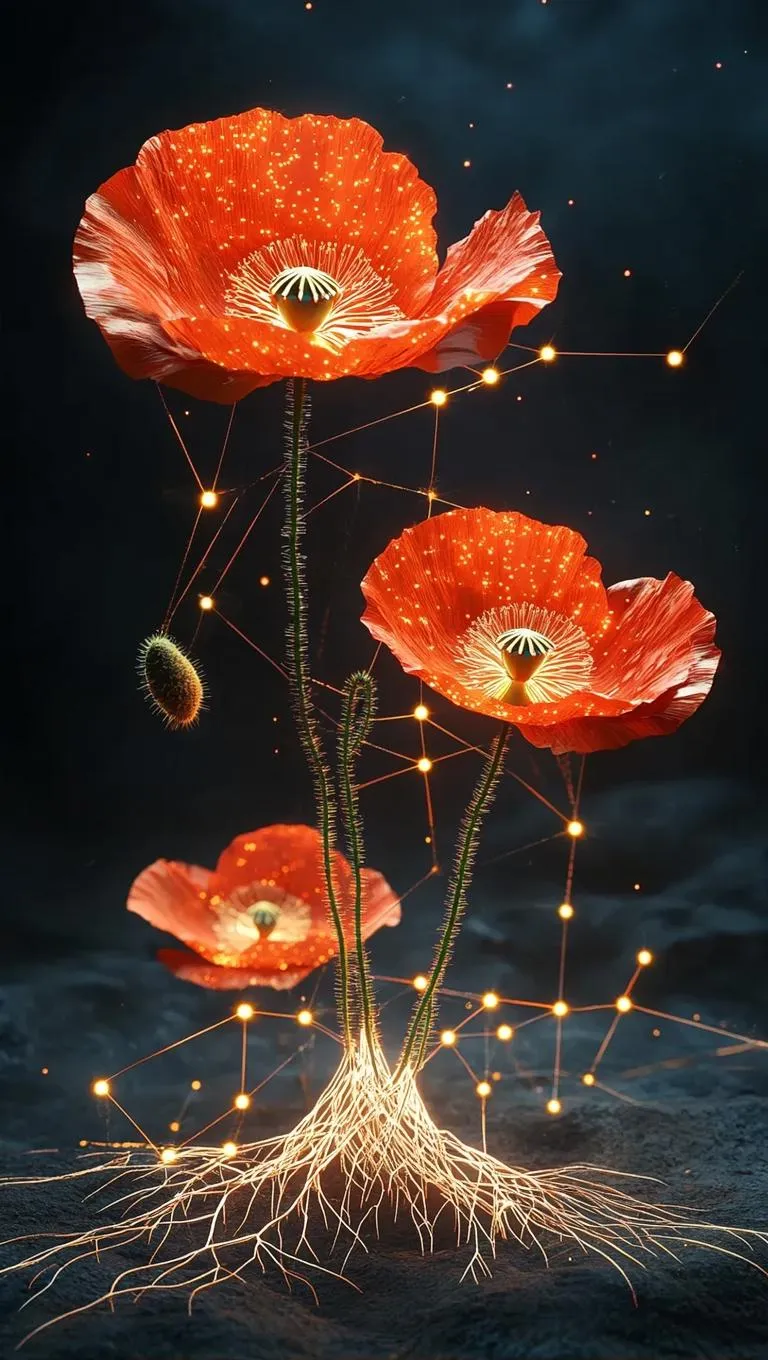 Transform text into stunning AI-generated visuals with three floating poppies, visible roots, and a realistic-futuristic fusion. Connected by dots under dramatic lighting, this surreal botanical art showcases Vivago.ai's tools for professional-grade creative projects. Craft striking imagery effortlessly through advanced AI effects and precision editing.