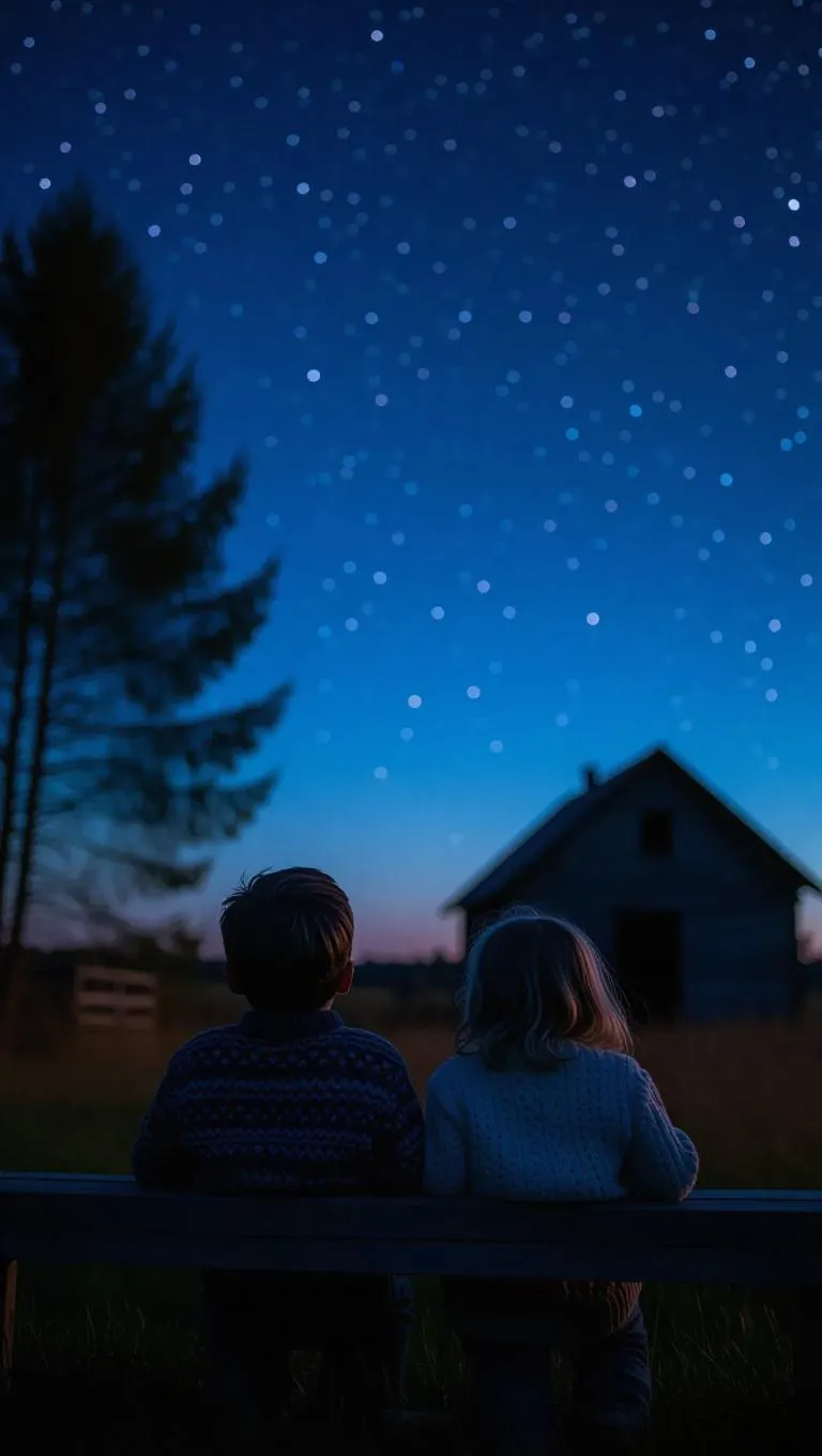 Film photo, soft night tones, two children in cozy sweaters lying on a wooden bench outside, gazing up at the starry sky, quiet night ambiance, silhouettes of trees and a rustic barn nearby, soft ambient light, deep blue sky, gentle dreamy mood, Russian village evening, Kodak Gold 400.