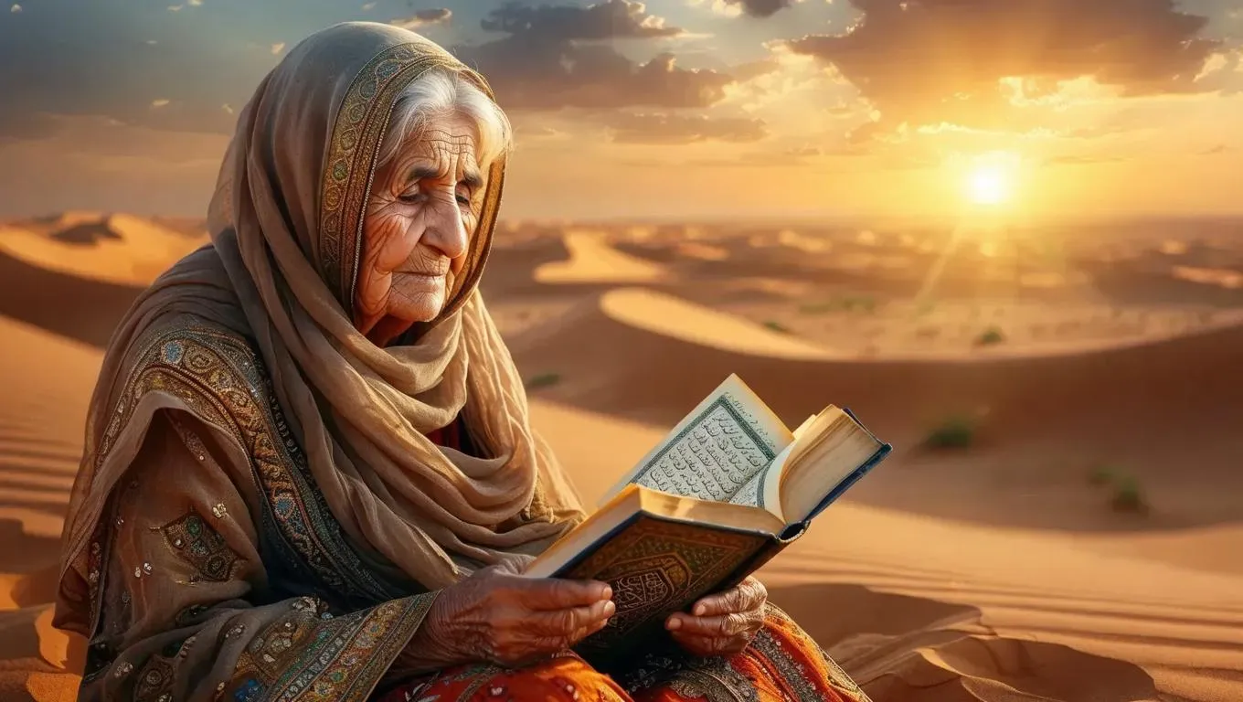 Vivid AI-generated image of an elderly woman reading the Quran alone in a serene desert landscape. Perfect for cultural storytelling, spiritual themes, and faith-inspired visuals. Experience solemn solitude and traditional devotion through AI-powered artistic creation with precise detail and atmospheric depth.