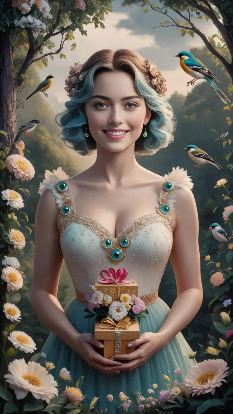 Generate stunning AI visuals of a woman with aqua eyes, medium hair, and a radiant smile amidst blooming flowers, lush trees, and birds. Perfect for creators seeking vibrant, nature-inspired AI art. Transform prompts into lifelike images with vivago.ai's advanced tools for professional-grade, imaginative results.