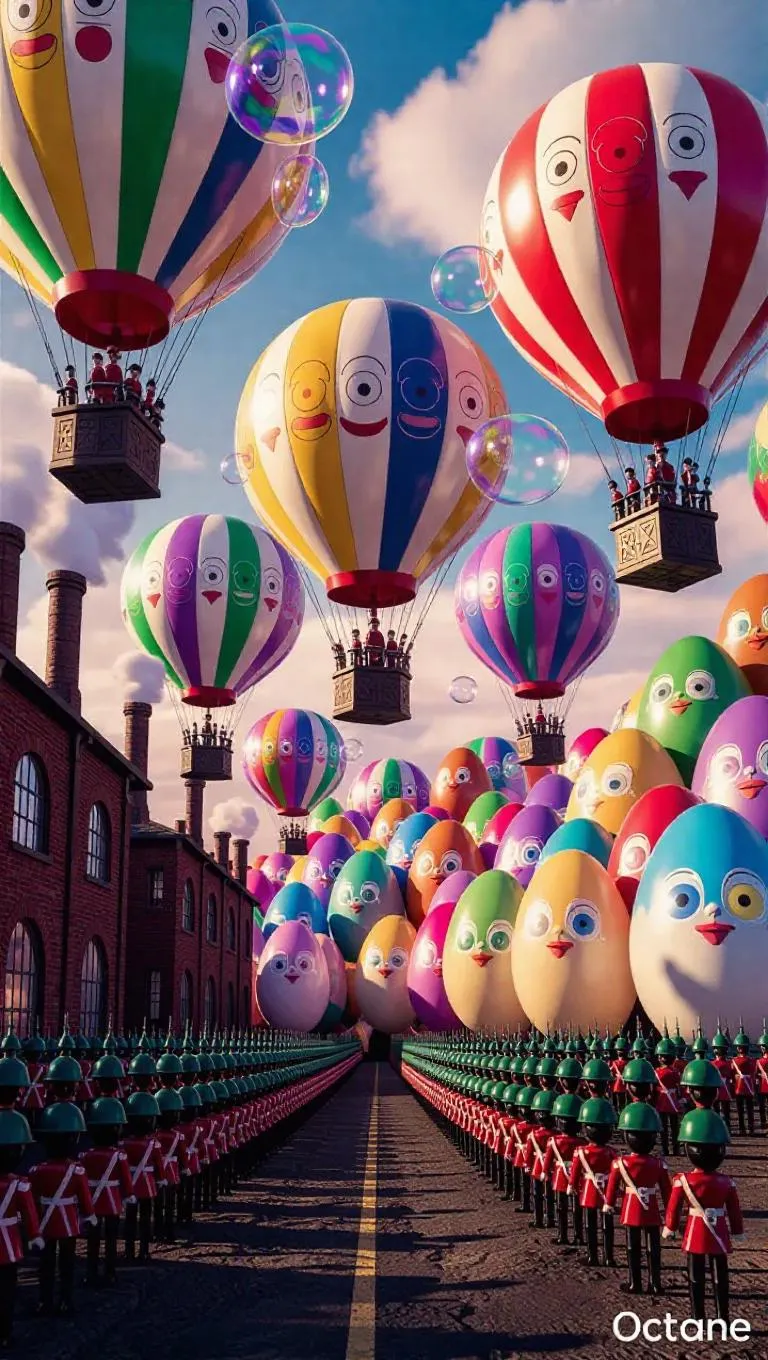 Explore a surreal AI-generated toy factory scene with vibrant LAB colors, 1440p Octane-rendered visuals. Featuring floating toy balloons, bubble-spewing chimneys, bead-strung soldiers, and hatching toy eggs. Depth of field highlights whimsical details in this absurd, ultra-HD fantasy world.