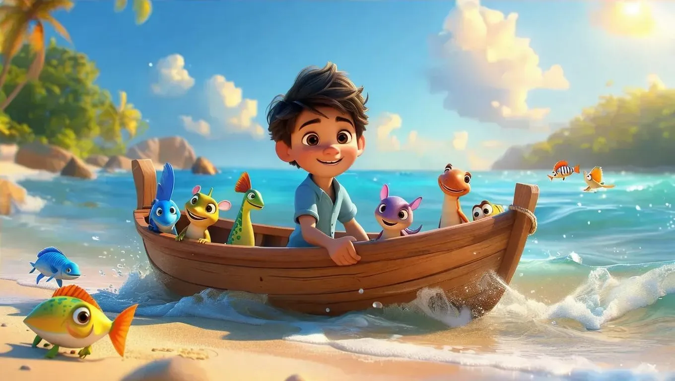 Create playful Pixar-style scenes with AI: Transform "child holding wooden boat with plastic animals" into vibrant 3D animations. Vivago.ai's AI image generator crafts whimsical, family-friendly visuals with rich textures and dynamic lighting for engaging storytelling. Perfect for children's content creators seeking professional-quality animated scenes.