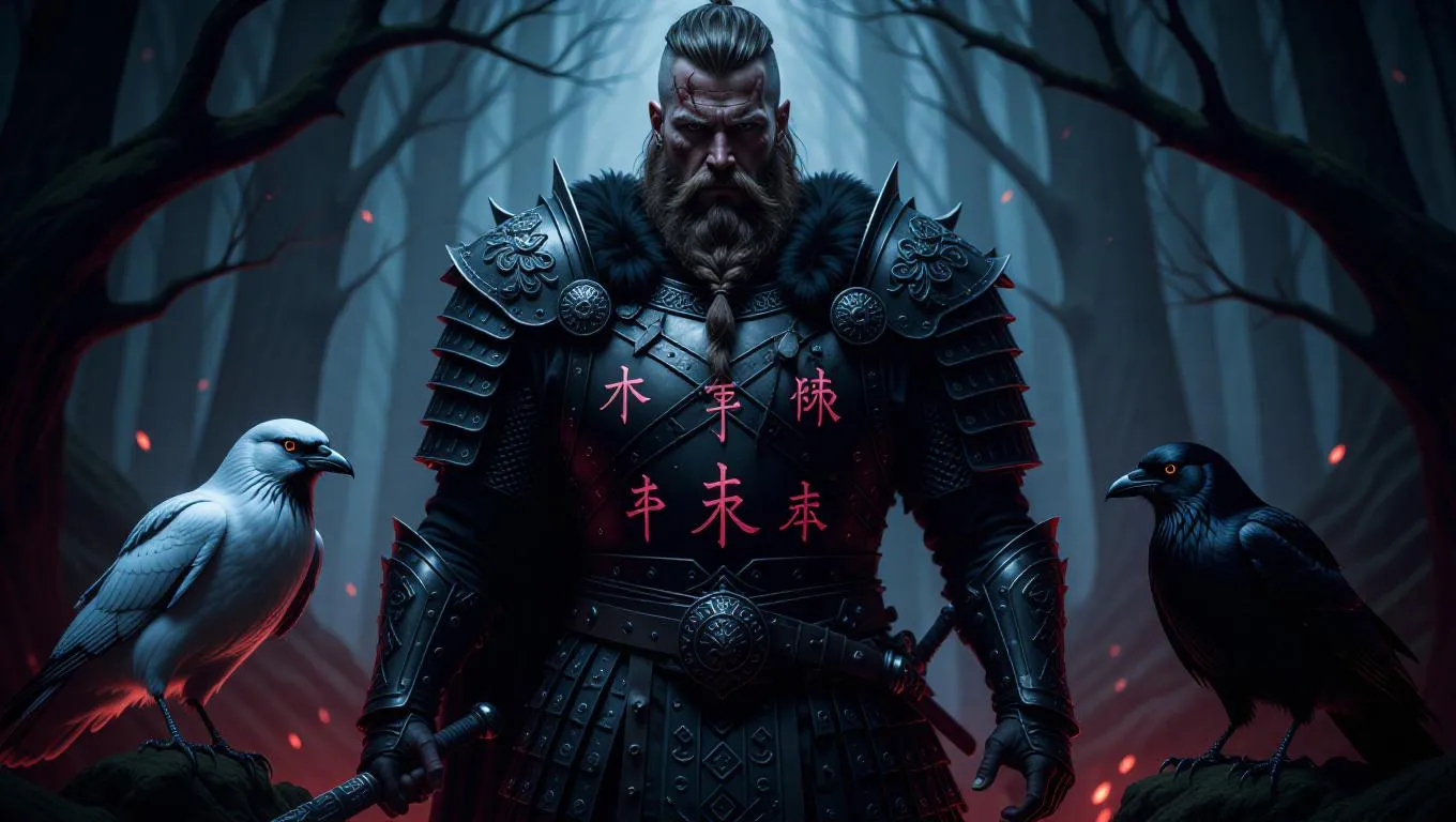 Create AI-generated art of a Viking samurai fusion in a supernatural forest with eerie twilight. Experience AI effects blending Norse runes, Japanese motifs, glowing kanji, and mystical crows. Perfect for cinematic visuals, dark fantasy themes, and professional-grade AI image generation. Transform prompts into haunting, detailed scenes with Vivago.ai's advanced creative tools.