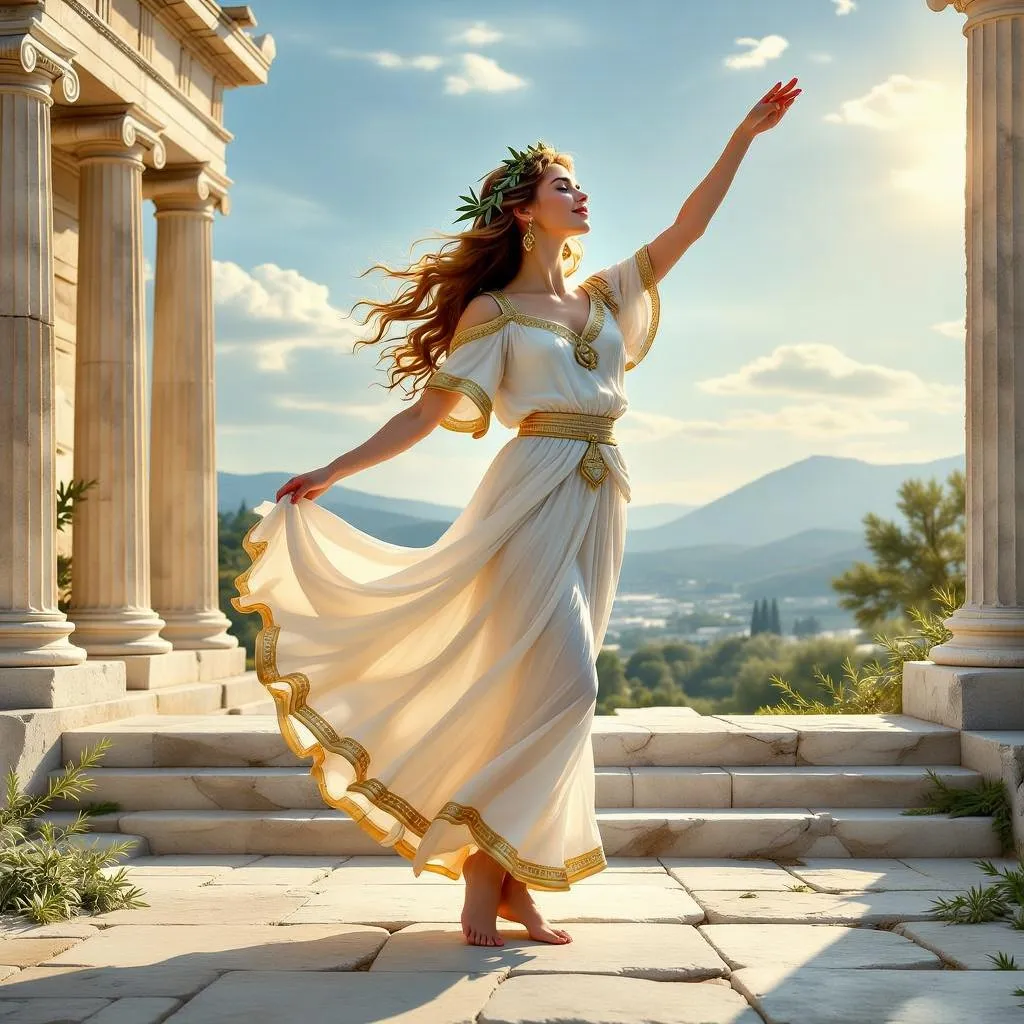 Vivago.ai crafts timeless AI art of an ancient Greek woman dancing gracefully in flowing white-gold attire, adorned with olive leaves. Set against the Parthenon, marble columns, and golden sunlight, this ethereal scene blends classical elegance with AI-enhanced details, inspired by Greek sculptures and frescoes for a serene, artistic masterpiece.
