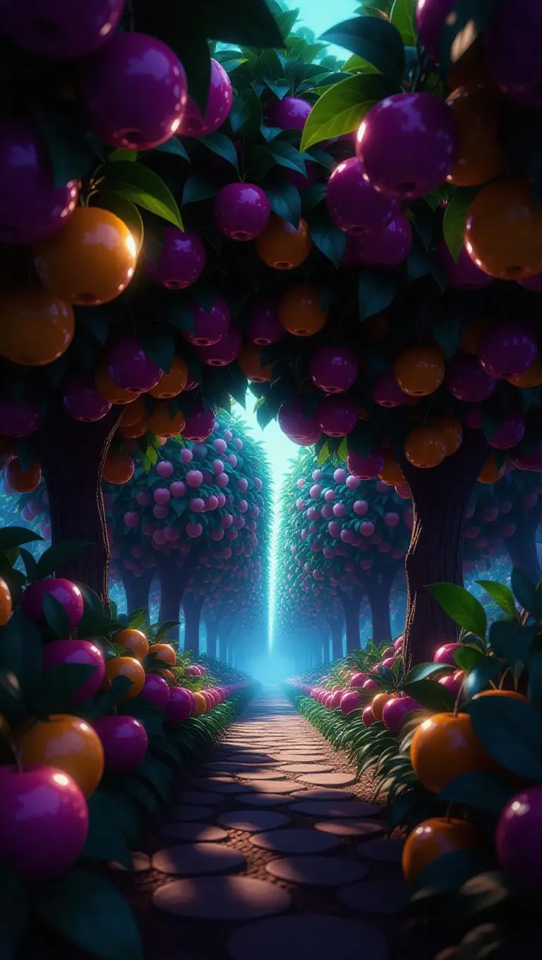 At the edge of the world, an infinite orchard where every fruit ever imagined grows on glowing, color-changing trees. Musical fruits hum melodies, floating fruits drift gently, and others taste like laughter or stardust. The orchard sings softly in the wind, time stands still, and you bloom eternally.