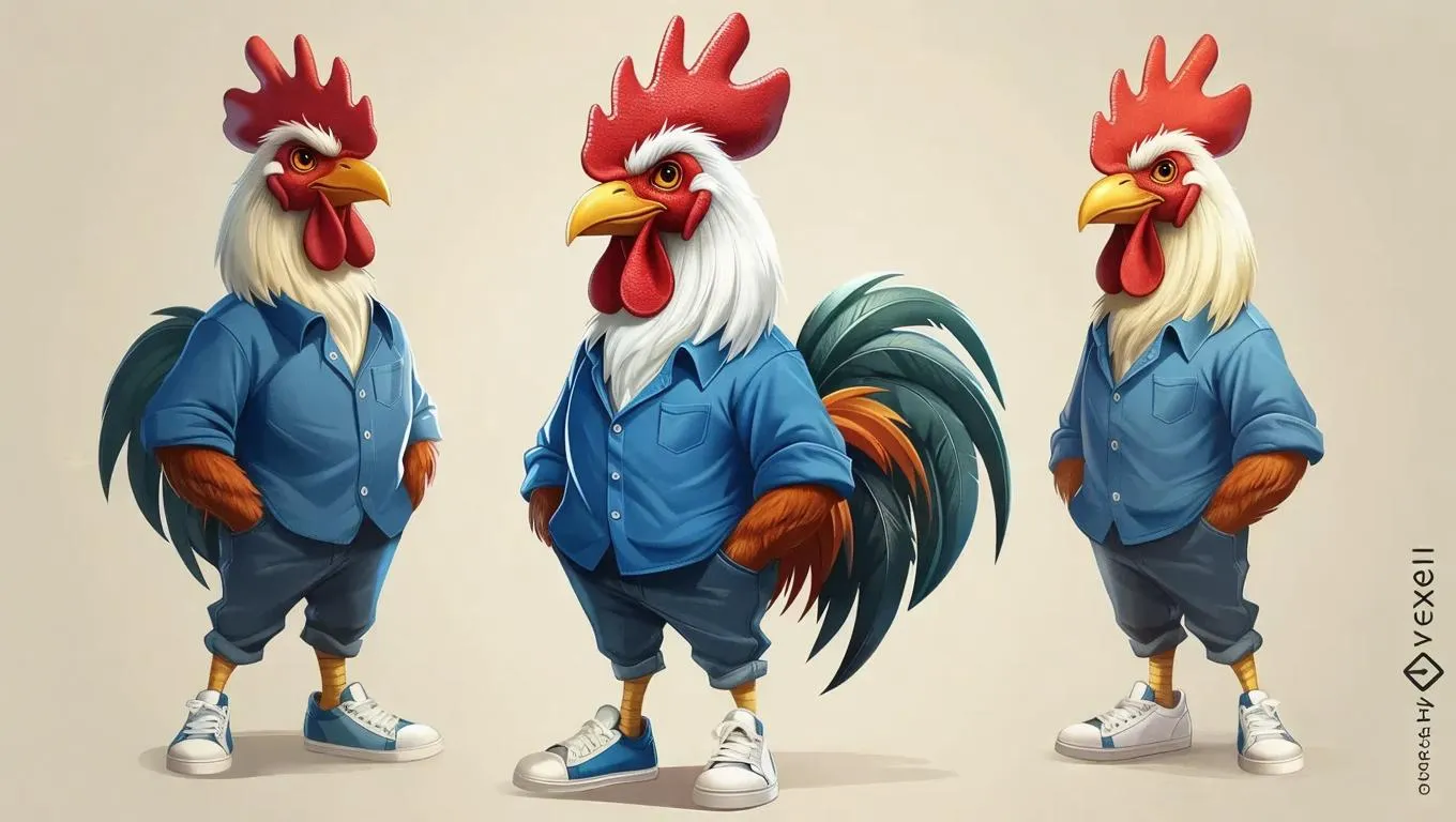 Create a playful AI-generated rooster mascot with human traits, sporting a vibrant blue shirt and crisp white sneakers. Ideal for branding or storytelling, this anthropomorphic design blends creativity and AI precision. Explore vivago.ai's tools for custom character art, seamless prompt-to-image generation, and professional-grade editing effects.