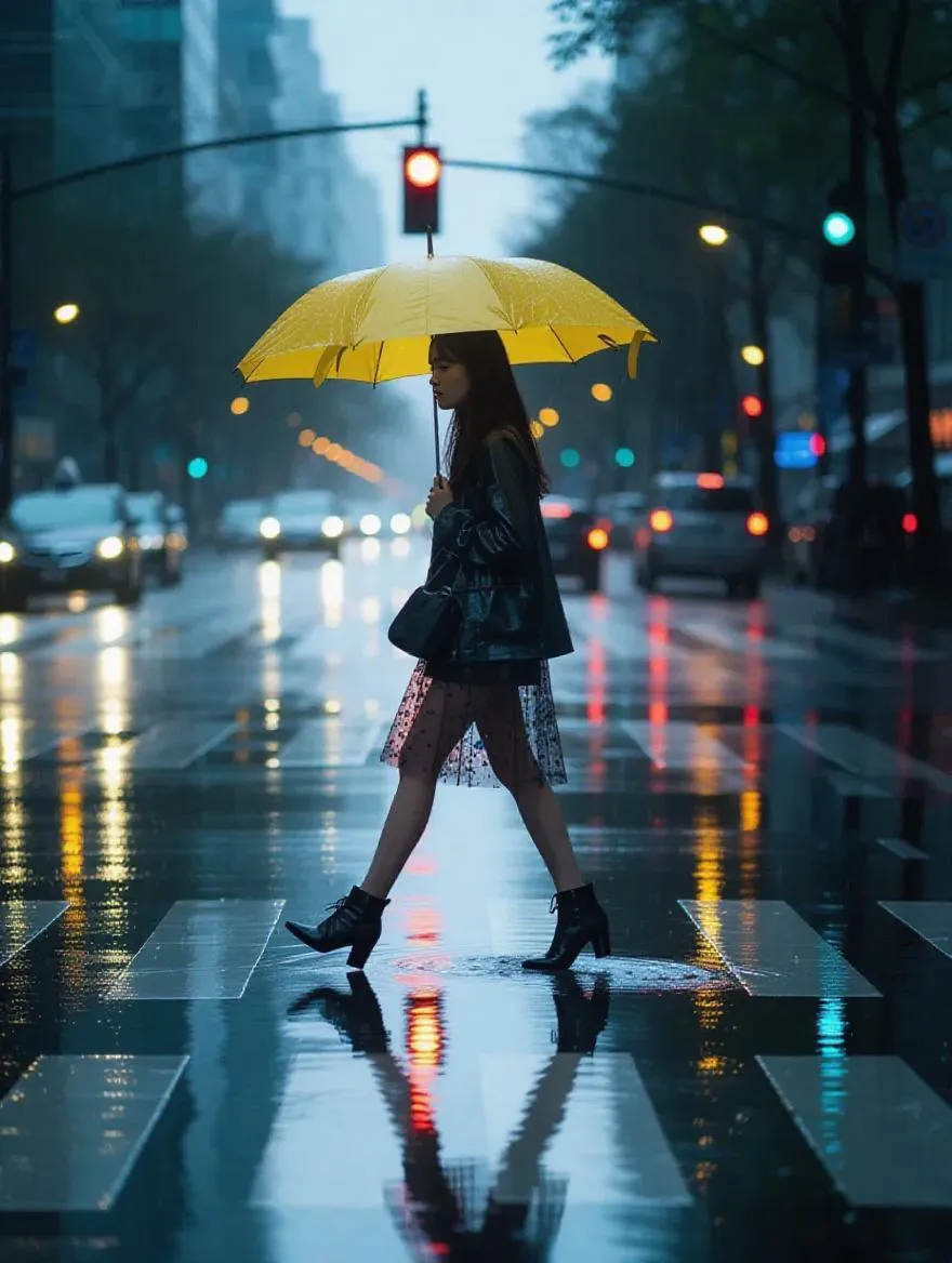 AI-generated cinematic rainy city scene: a woman crossing at pedestrian crosswalk holding yellow umbrella in cool blue-grey tones. Semi-transparent outfit glistens with realistic raindrops on pavement showing subtle reflections. Softly blurred background with streetlights & cars creates quiet, introspective mood. Cinematic lighting & soft shadows. Powered by vivago.ai's AI effect tools.