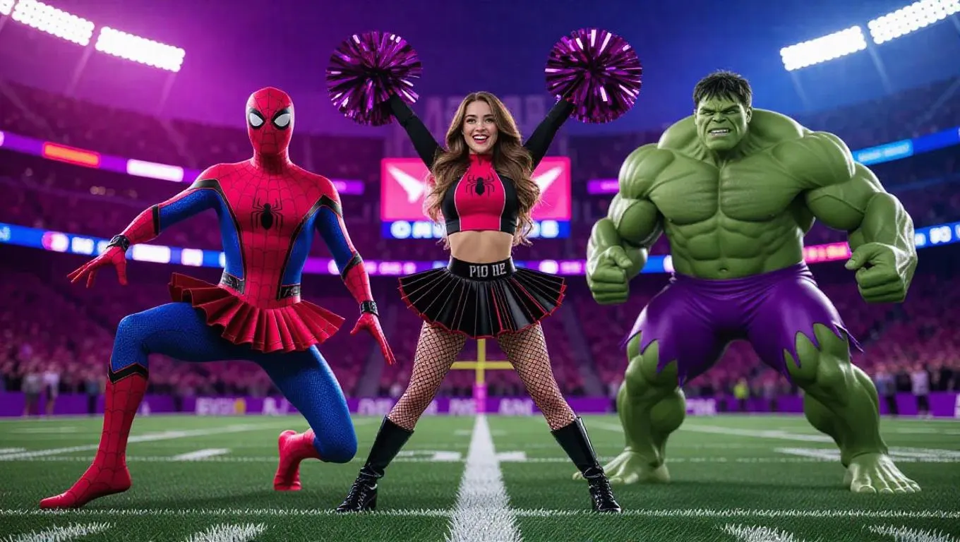 In a brightly lit football stadium, Spider-Man, Deadpool, and Hulk are dressed as an outrageous cheerleader squad. Each wears a unique glittery mini skirt and a superhero-themed crop top. Spider-Man’s skirt is tight red latex with web patterns and a cheeky spider emblem on the back. Deadpool rocks a black-and-red pleated skirt with tiny toy grenades dangling like charms, paired with fishnet tights. Hulk wears a neon green stretchy mini skirt barely covering his massive thighs, with purple stripes and ripped edges. They're mid-dance routine: Spidey flips into a split, Deadpool strikes a twerk pose with pom-poms spinning, Hulk stomps and does high kicks. Stadium lights flash, confetti falls, the crowd roars. Bright, funny, chaotic, high-energy, 16:9 ratio, meme-level visual.
