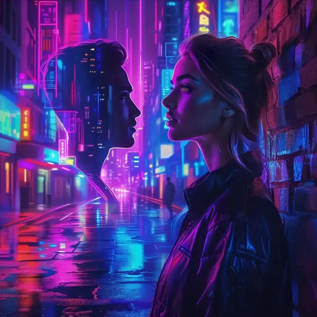 Generate mesmerizing AI visuals of a neon-lit street scene with synthwave hues, featuring a woman gazing at a mysterious shadow silhouette. Perfect for Trance/Techno vibes, this AI effect blends retro-futuristic aesthetics with cinematic depth, ideal for music visuals, edgy art projects, and cyberpunk-inspired storytelling.
