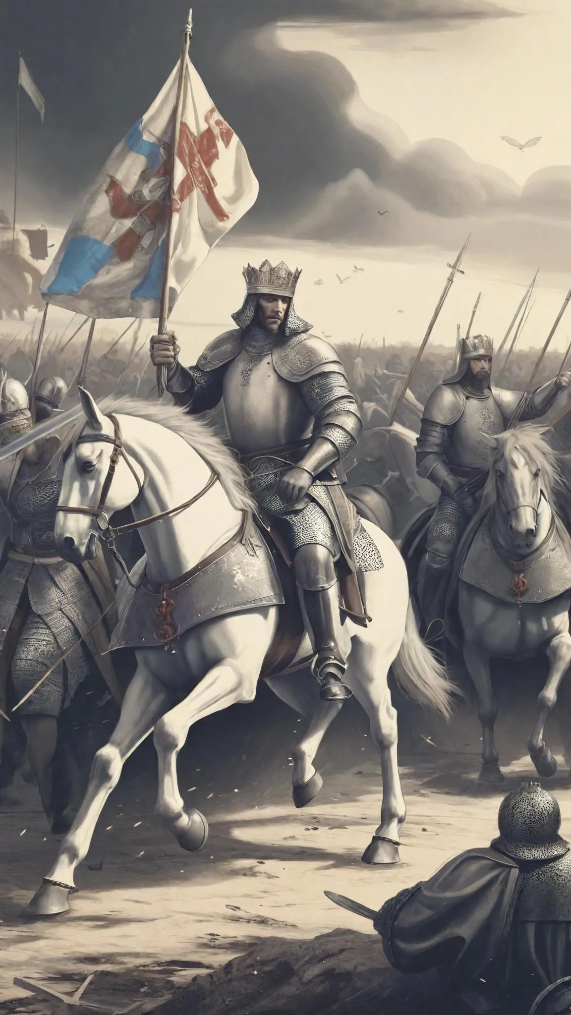 Create AI-generated medieval battle scenes with King Afonso Henriques leading Portuguese knights against Castilian forces. Vivago.ai crafts detailed historical art, featuring Cinco Quinas shields, red/gold banners, clashing swords, and charging horses for epic visual content. Enhance armor, sunset drama, and muddy battlefields using AI image tools for professional-grade historical imagery.