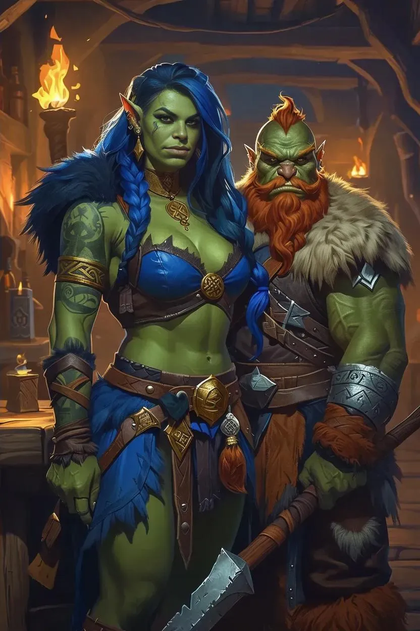 Create AI-generated mystic fantasy art with Vivago.ai's tools. Depict a half-Orc Barbarian shamaness and Dwarf Mercenary duo in a steampunk tavern—realistic ink painting style blends futuristic elements, dramatic shadows, and magical weapons. Perfect for RPG visuals, book illustrations, or dynamic character designs. Transform prompts into professional-grade mystic fantasy scenes effortlessly.