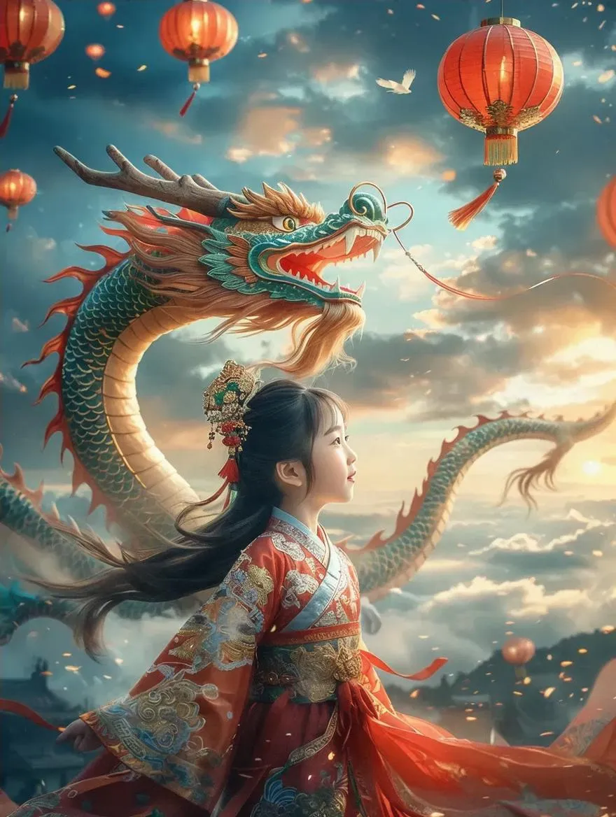 Transform text into mesmerizing AI art with vivago.ai! Generate a Chinese ancient masterpiece featuring a graceful girl in traditional attire, soaring dragons, and luminous sky lanterns. Elevate your visuals with AI-powered creativity, blending cultural motifs and vibrant scenes for professional-grade, enchanting artwork effortlessly.