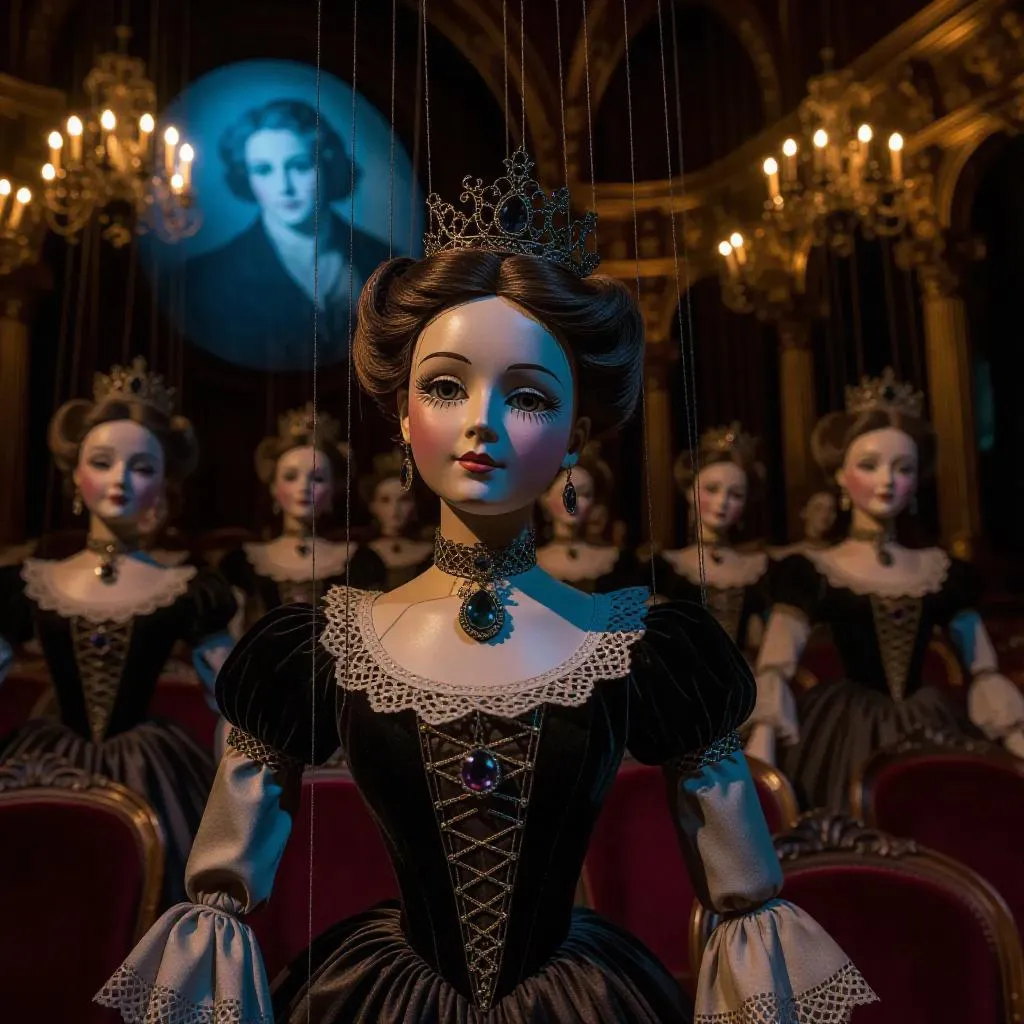 A moonlit derelict opera house filled with weathered marionettes frozen mid-performance. Elaborate puppets with ivory-carved faces, cracked jeweled eyes, and tattered velvet robes hang from tarnished silver strings, limbs contorted in tragic poses. Pale blue light spills through shattered stained glass, casting kaleidoscopic shadows across rotting velvet seats and a stage littered with broken music boxes. A spectral puppetmaster's faded portrait glows faintly above the proscenium, hollow eyes controlling the dance as cobweb-covered chandeliers sway silently. Ultra-detailed textures: moth-wing lace collars, oxidized copper joints, and clockwork hearts visible through cracked chests. Cinematic low-angle framing emphasizing towering marionettes against arched ceilings, cold moonlight blending with flickering candle remnants for haunting chiaroscuro.