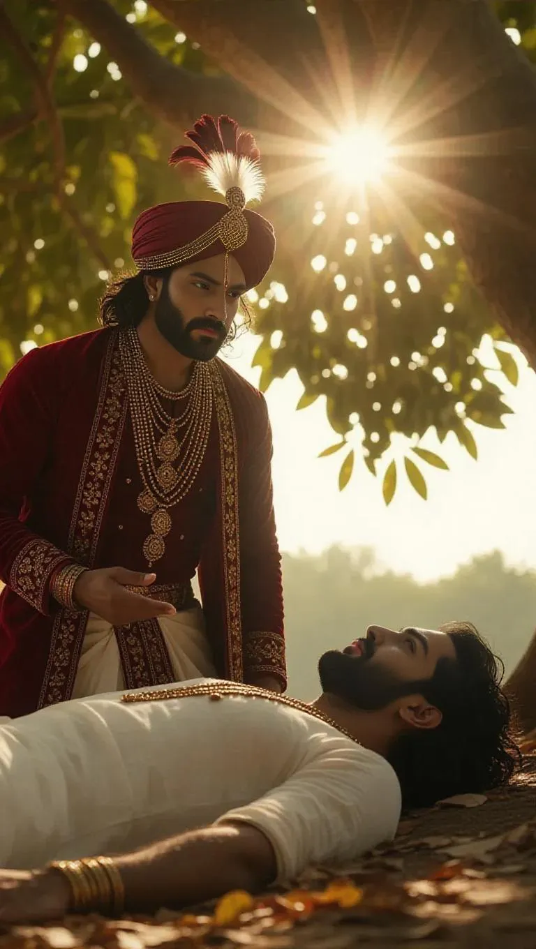 4K Ultra HD cinematic scene of King Madanpal and a serene ascetic under an ancient banyan tree. Intricate details: maroon-gold royal robes, sunbeams through dense leaves casting shadows, dusty terrain with aerial roots. Vivid AI-generated visuals blend regal curiosity and ascetic calm, highlighting textures, lighting, and mystical ambiance in a single frame. Explore royal and spiritual contrasts with professional-grade AI artistry.