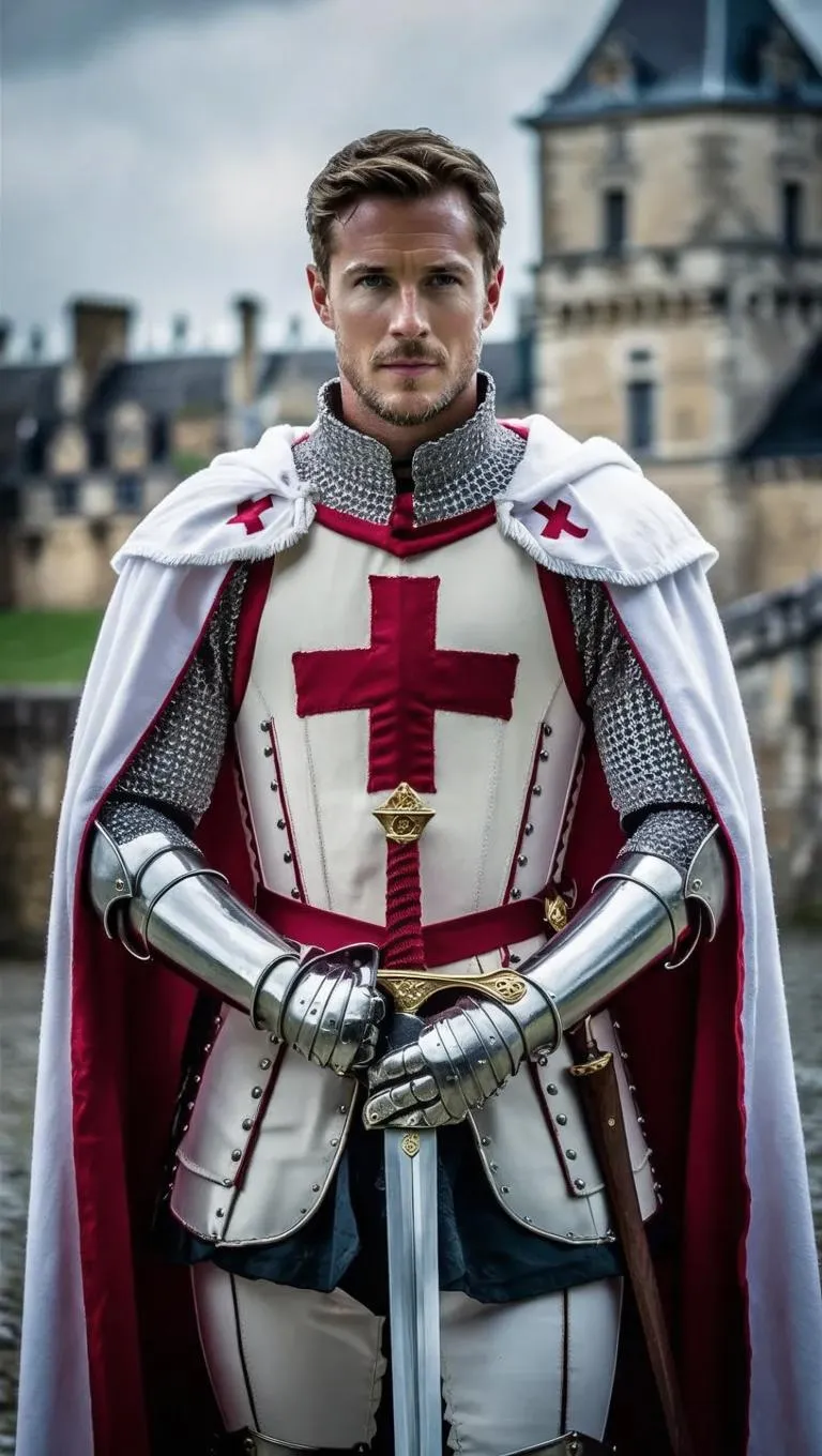 Craft a striking AI-generated image of a French knight adorned with a red cross emblem on his white corset and flowing cloak. His grip on the gleaming sword radiates determination, while subtle intensity in his eyes reveals forbidden passion. Ideal for medieval art, historical storytelling, or AI-powered character design with emotional depth.