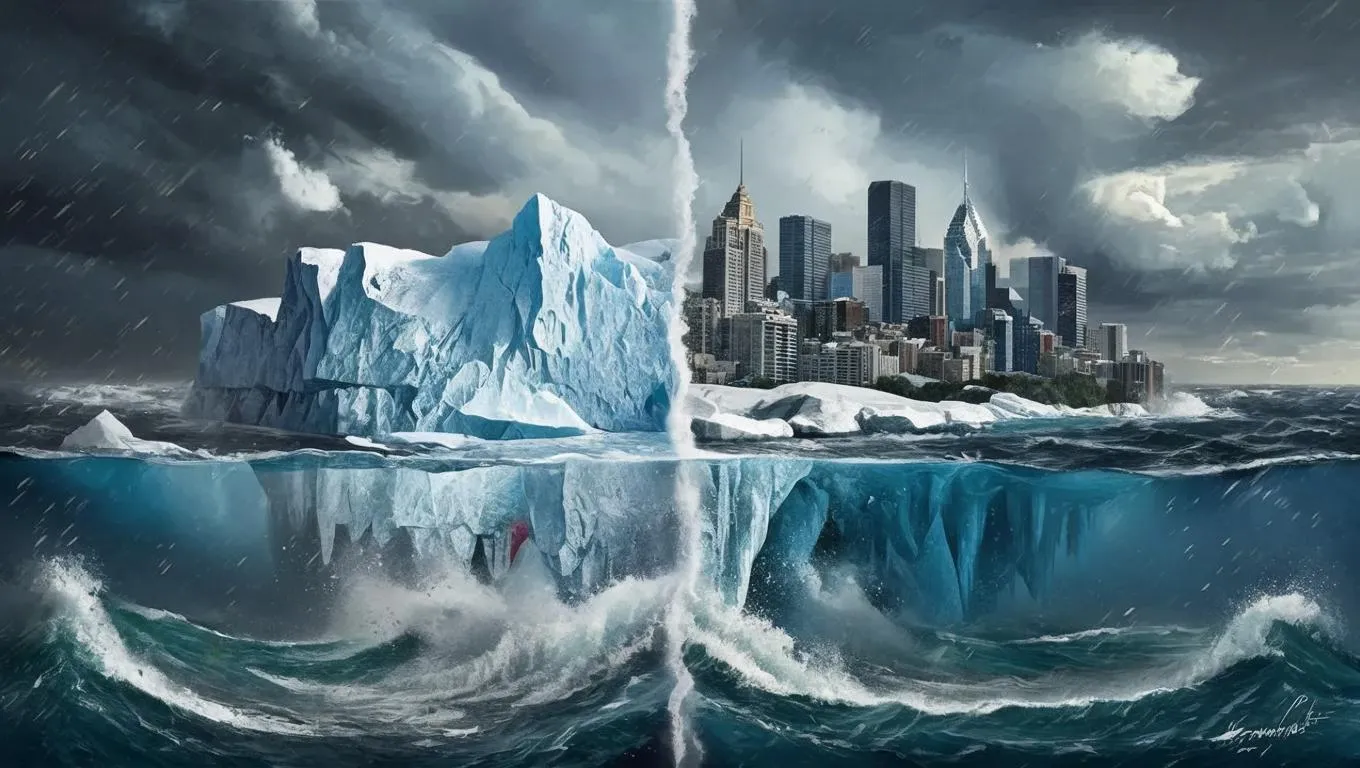 Generate a striking AI illustration contrasting global warming realities—melting glaciers, rising seas, extreme weather—with climate change myths. Use vivid symbols and urgent visuals to highlight environmental impacts versus public complacency. Explore AI-powered creative tools for impactful climate change awareness campaigns and visual storytelling that sparks crucial environmental dialogue.