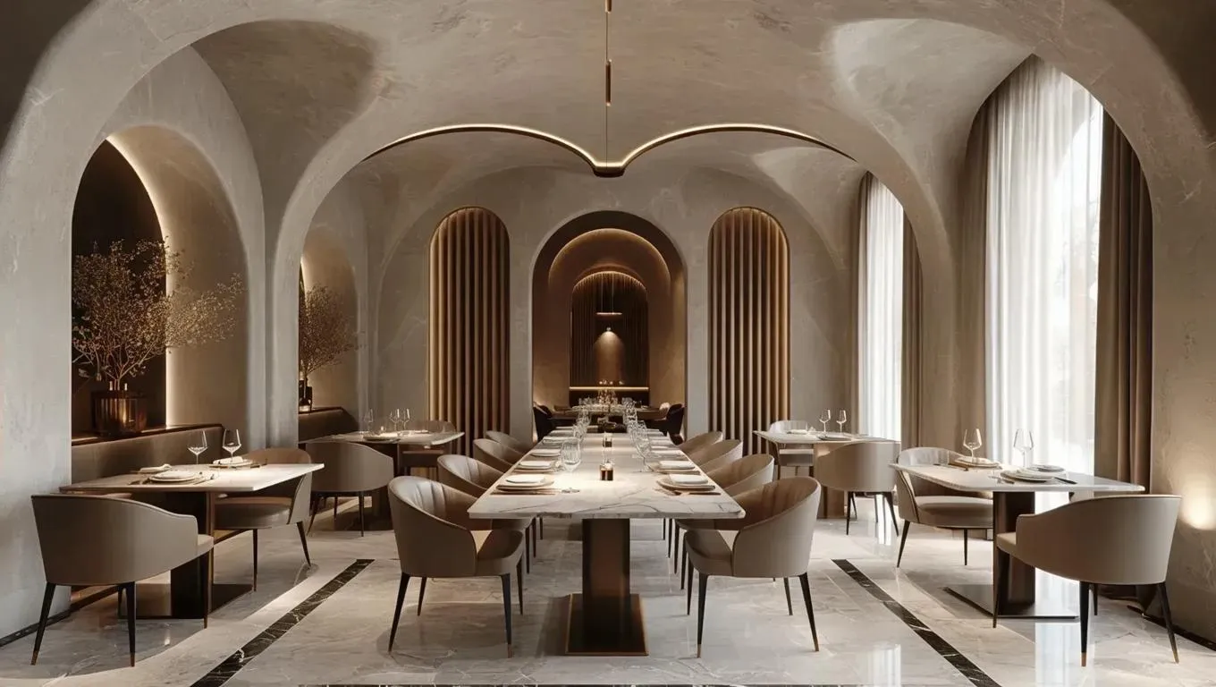 Create an elegant private dining room for modern Italian restaurants with vaulted minimalist arches, ambient lighting, and geometric black-white flooring. Features a marble table, leather chairs, recessed wine cabinet, and floor-to-ceiling windows with sheer curtains. Blend refined Italian charm, metal accents, and natural touches for exclusive, cozy gatherings in a luxurious, intimate space.