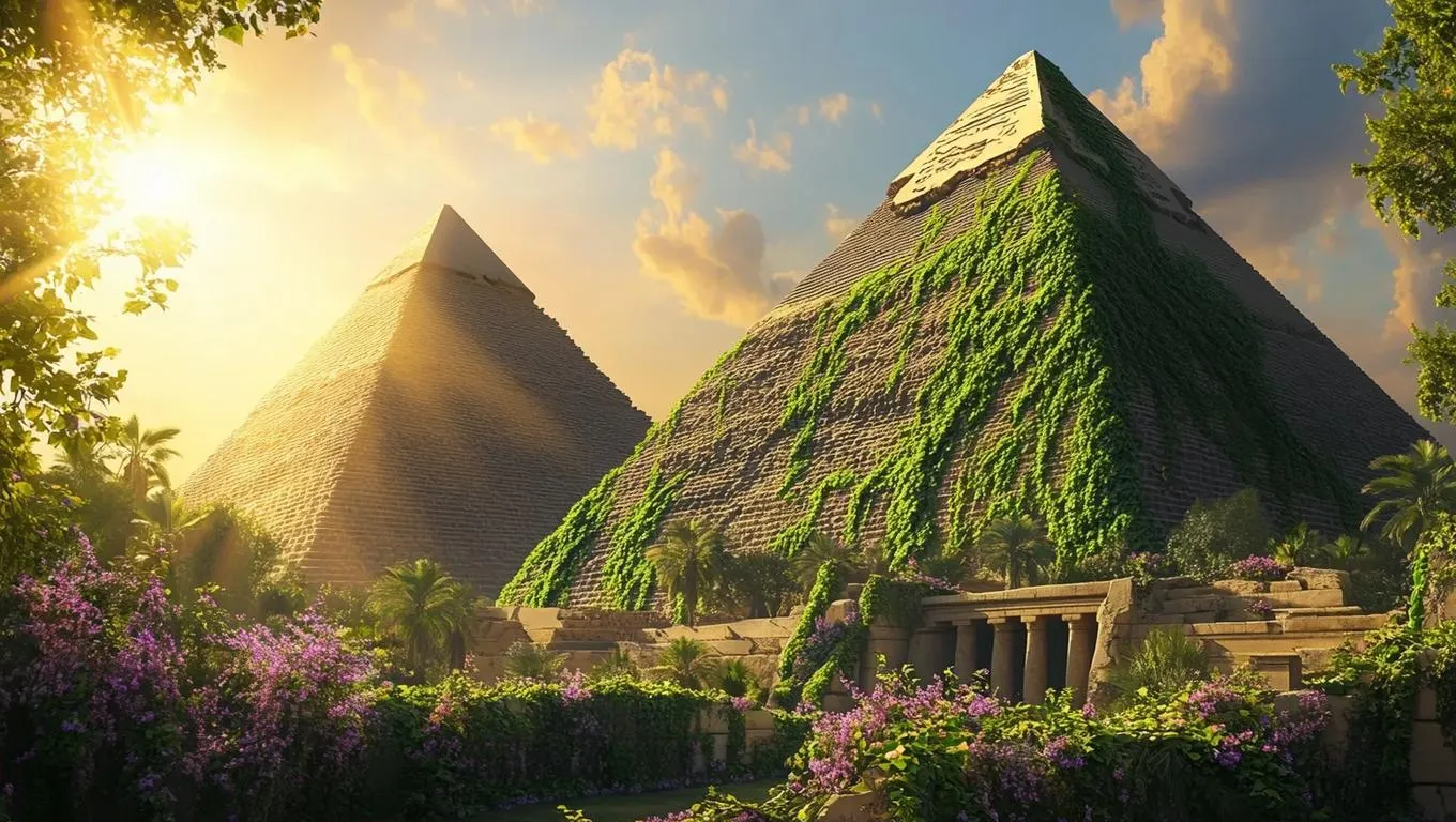 Three majestic pyramids rise against the vibrant spring landscape, their ancient stones draped in over 10 lush ivy vines and blossoming flowers, creating a magical and serene atmosphere. The sun shines brilliantly, casting warm, golden light that highlights the intricate details of the flora and the timeless architecture. The scene is photorealistic, capturing the natural beauty and historical grandeur of the pyramids.
