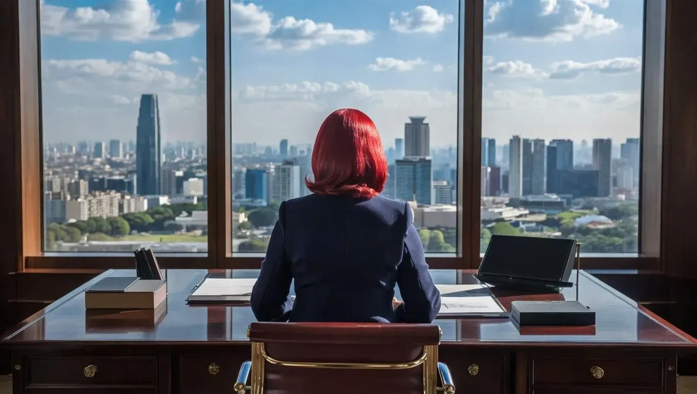 Transform text into stunning visuals with VivaGo.ai's AI image generator. Create a modern presidential office scene: red-haired woman leader, city panorama, sunny day, wide-angle frame. Leverage Sky Blue AI effects for vibrant, professional-grade imagery. Perfect for designers and content creators seeking dynamic, AI-powered visual storytelling.