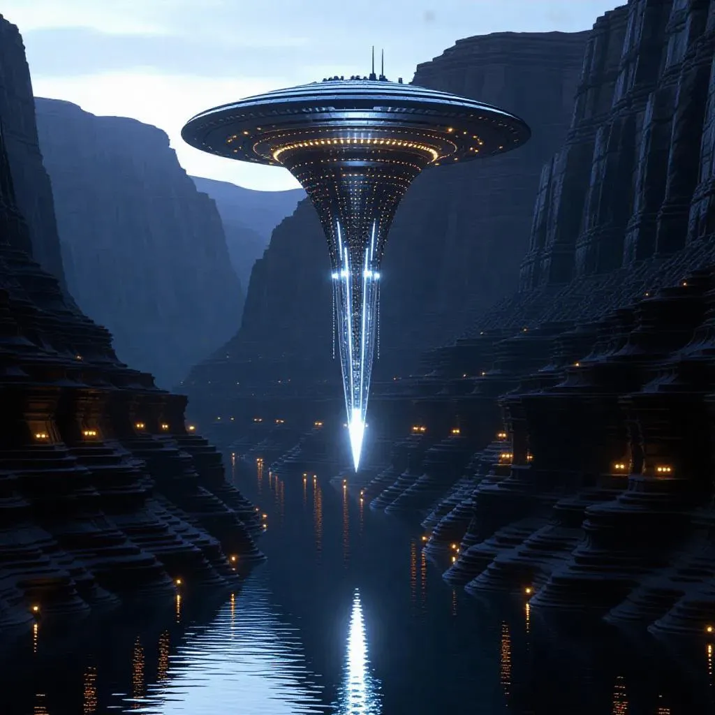 Craft a mesmerizing AI-generated sci-fi landscape with a futuristic floating structure: glowing disc, crystalline spire, and canyon river. Enhance mystery with bioluminescent lights, layered rock textures, and reflective water effects. Perfect for ethereal, otherworldly visuals using Vivago.ai's AI image tools.