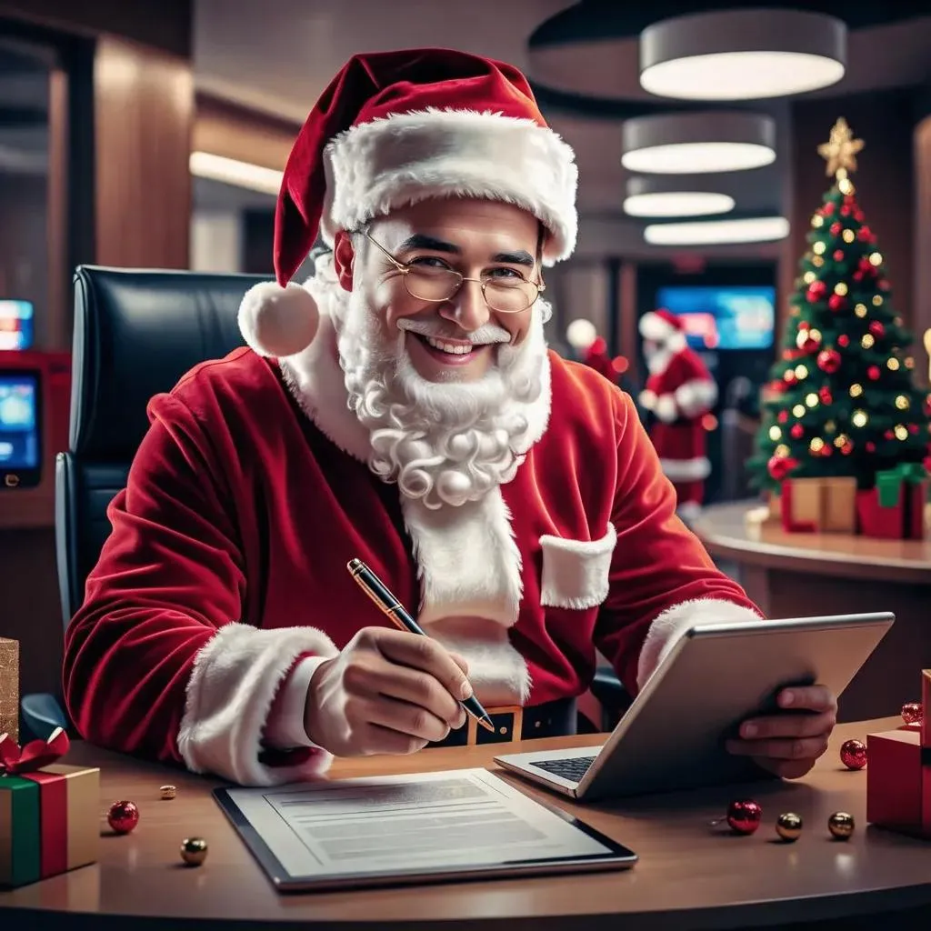 Create a playful AI image of Santa as a banking professional, blending holiday spirit with corporate flair. Ideal for festive marketing, greeting cards, or workplace humor using VivaGo.ai's AI tools for vibrant, professional-grade visuals.
