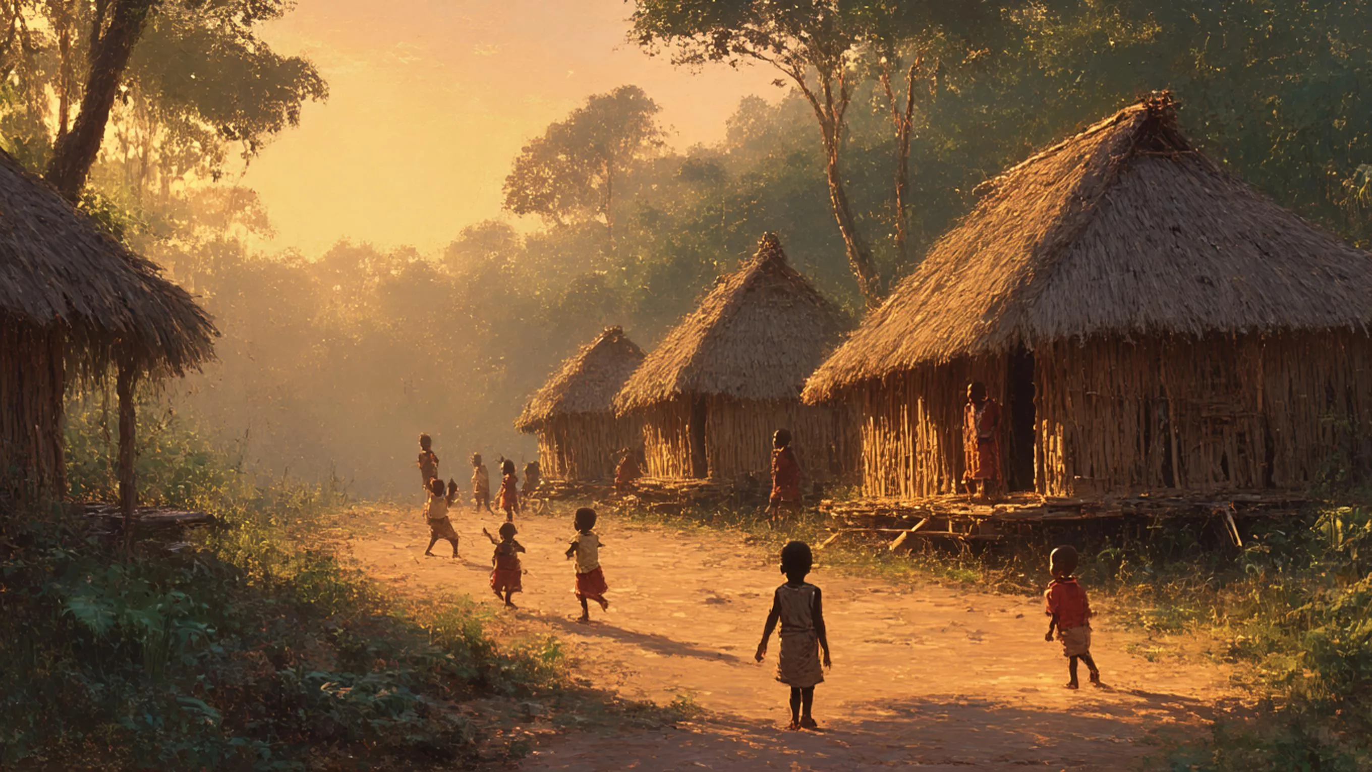 Village Kissi traditionnel au lever du soleil, cases en bois, enfants jouant, forêt dense en arrière-plan, style peinture africaine, couleurs chaudes.