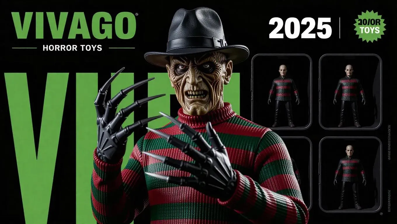 Premium collectible Freddie Krueger action figure with iconic bladed glove, rendered in photorealistic HD. Features serious expression, standing pose, and character-specific accessories in blister-pack compartments. Sleek black packaging highlights "VIVAGO Horror Toys" branding with green/white text and white "2025" label. Ideal for horror enthusiasts seeking high-def Nightmare on Elm Street memorabilia in premium toy collectible style.