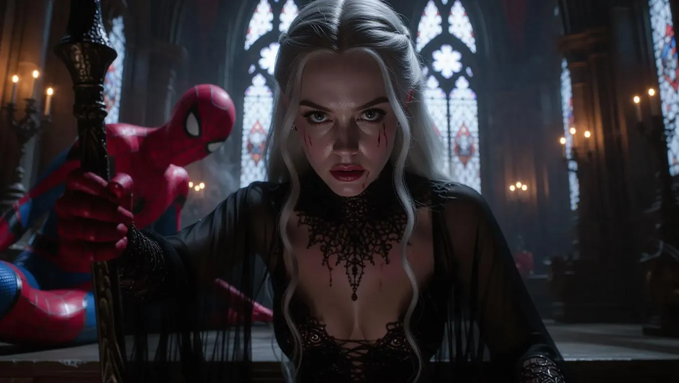 A gaunt, pale sorceress with silver hair and smoldering kohl-lined eyes dominates a decaying castle hall, her crimson gaze piercing through tattered black chiffon robes that cling to voluptuous curves as she leans forward on an ornate obsidian staff. Torchlight filters through cracked stained glass, casting amber hues on metallic nipple piercings and sweat-slicked skin beneath fraying underboob drapery. Behind her, Spider-Man lies enchanted in cobweb-shrouded slumber beneath vaulted stone arches, while a colossal arachnid looms in shadowy recesses. Hyper-detailed textures emerge - cracked leather thigh-boots, swirling dust motes, chipped black lipstick - captured through dramatic Dutch angles with gritty film grain and chiaroscuro lighting emphasizing both mystical power and gothic decay.