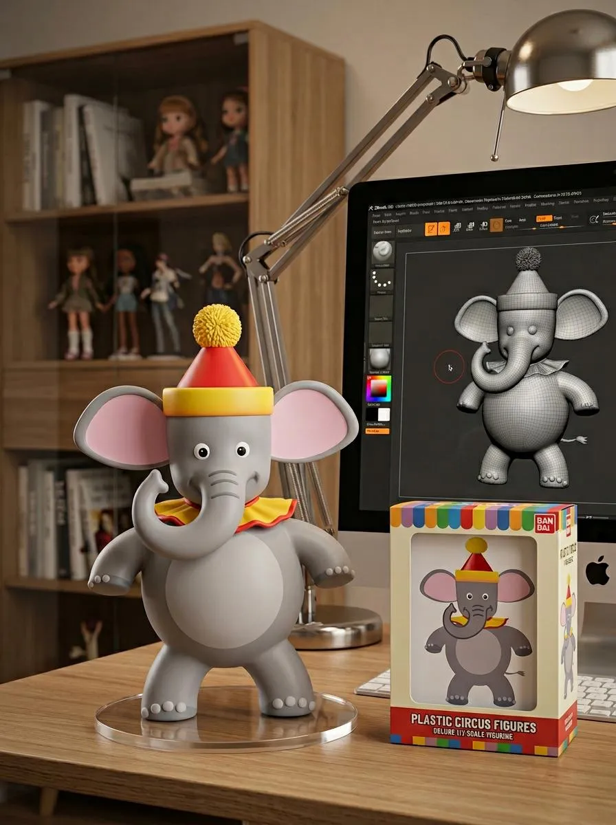 Create a 1/7 scale commercialized figure of the character in the illustration, in a realistic style and environment. Render the exact hairstyle and the same outfit with the uploaded figure. Render garments as molded plastic with engraved seams and sculpted folds; keep accessories as plastic parts. Fictionalize any brand text/logos while keeping layout and colors. Place the figure on a computer desk, using a circular transparent acrylic base without any text. On the Apple computer screen, display the Z Brush modeling process of the figure. Next to the Apple computer screen, place a BANDAl-style toy packaging box printed with the original artwork. The background shows a modern realistic room furnished with contemporary furniture, including a display cabinet filled with books, dolls, and scale figures, adding a casual and everyday atmosphere. Behind the Apple computer, place a desk lamp to add detail and depth to the scene.