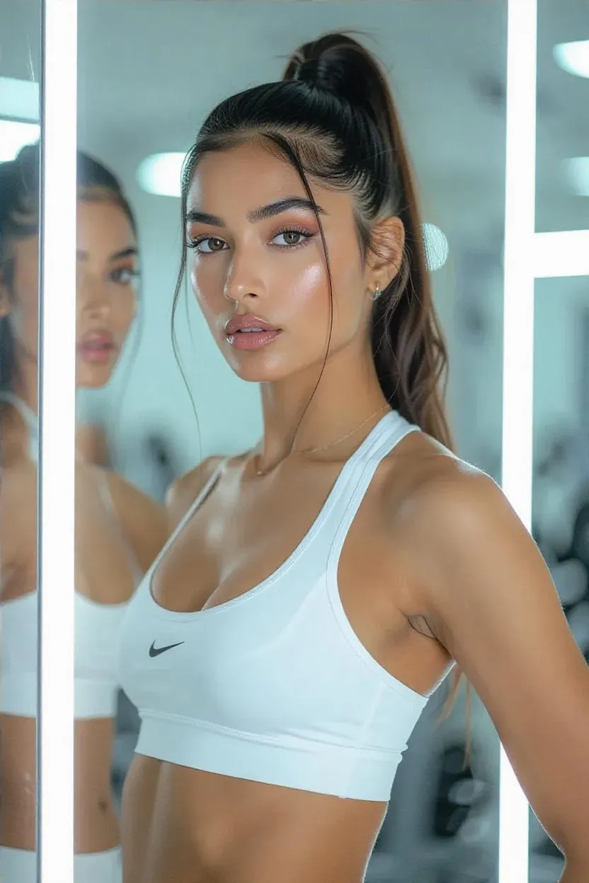 Create a confident AI-generated Indian virtual fashion influencer with VivaGo's AI tools. Design gym-inspired outfits, sleek ponytails, bold eyes, and flawless skin in digital art style. Generate full-body poses with soft lighting, minimal backgrounds, and mirror reflections using text-to-image AI. Perfect for virtual influencers, fashion content, and digital artistry with professional editing effects.