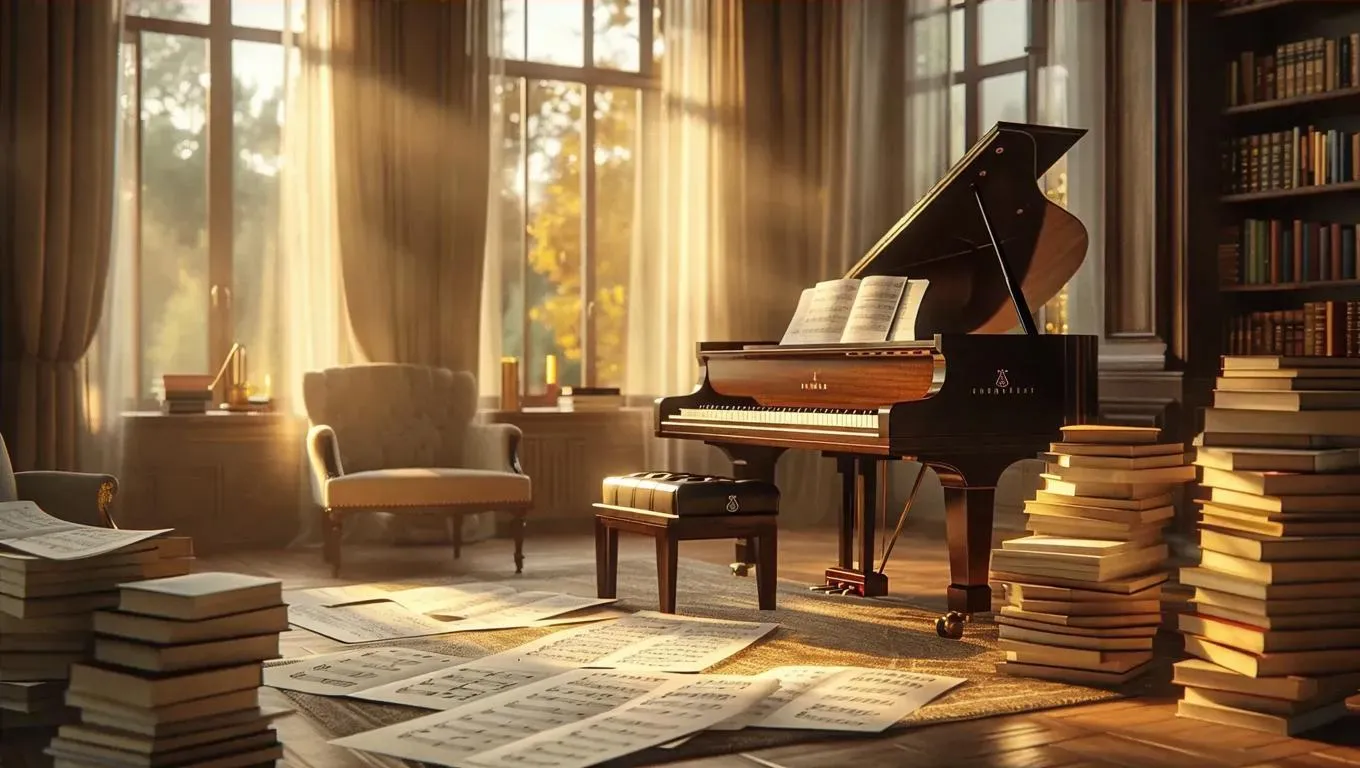 Create a cozy AI-generated piano room with warm ambient lighting. Transform text prompts into a serene creative space featuring a grand piano, scattered music sheet papers, and plush furnishings. Perfect for composers seeking inspiration or artists desiring atmospheric backdrops with professional AI tools.