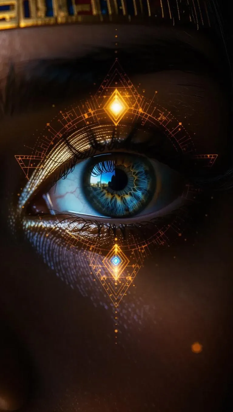 Generate mystical AI imagery with Vivago.ai: Ancient Egyptian eye symbol glowing on a woman's third eye, spiritual aura, protective light, sacred geometry, warm gold and deep blue tones. Transform text into 4K cinematic visuals using AI-powered tools for ethereal, professional-grade mystical realism.