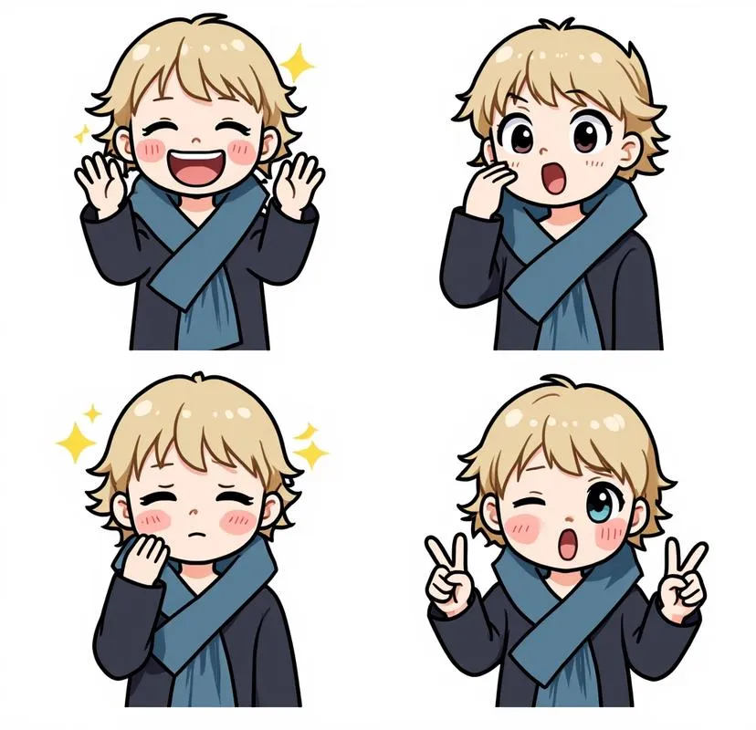 A 2D chibi-style full-body illustration of the girl, transformed into a cute and expressive emoji-like character. The proportions are 1:1 for head and body, making her look like a tiny chibi figure. The style is simple, minimal, and cartoonish, like a doodle character with bold clean outlines. Displayed on a pure white background, arranged in a four-panel grid format. Each panel shows the same chibi girl in a different expression and full-body pose: Top-left: a bright happy smile with sparkling eyes, arms slightly raised. Top-right: surprised expression with wide-open eyes and small open mouth, hands near her cheeks. Bottom-left: shy blushing face with eyes looking slightly down, fingers touching together nervously. Bottom-right: playful tongue-out expression with one eye winking, one hand making a peace sign. Clean flat colors, bold outlines, kawaii sticker-like style, perfect for emoji or reaction images.