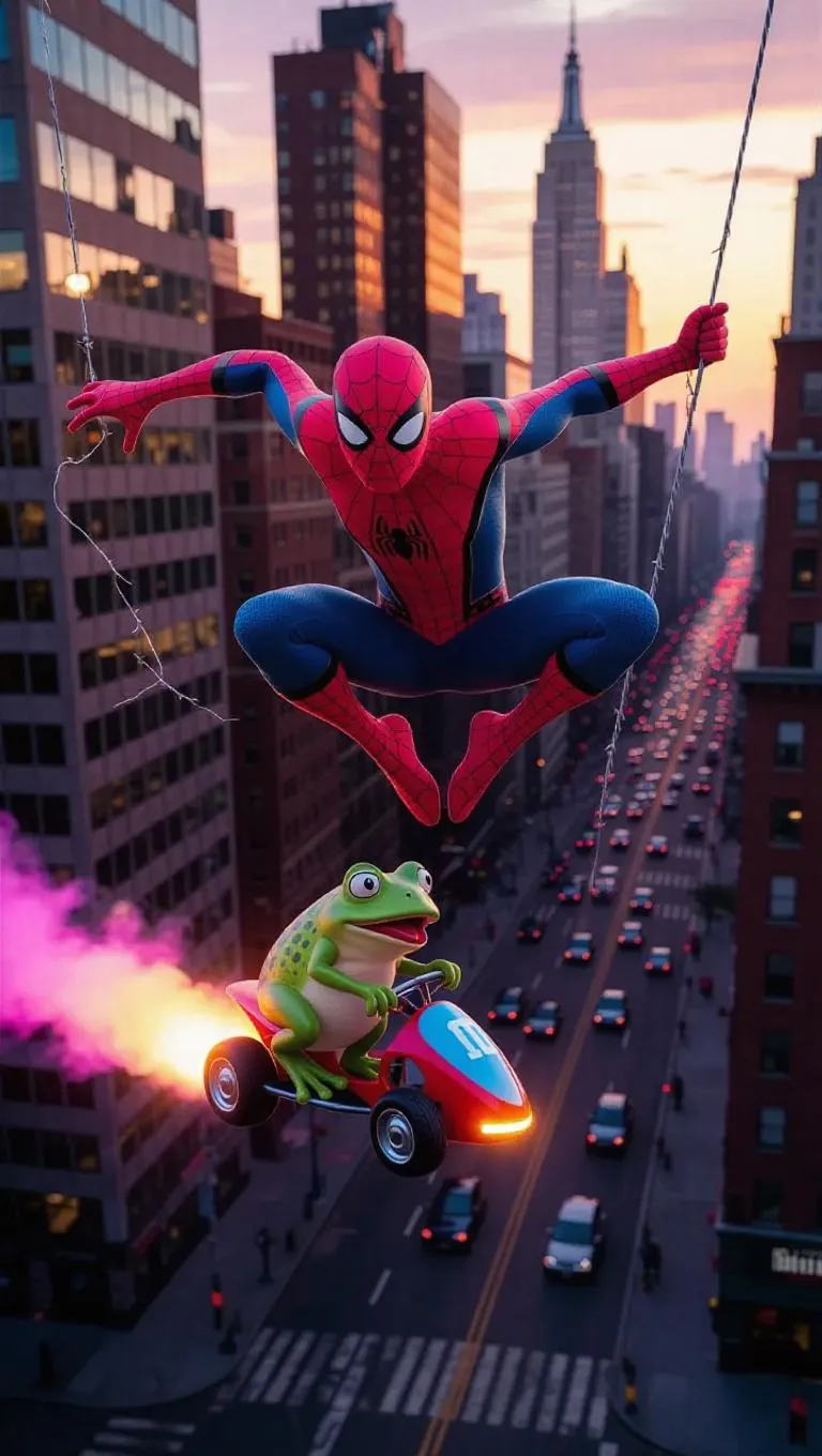 “A spider-suited superhero swings between skyscrapers in a realistic New York City at sunset, chasing a bizarre cartoon frog on a tiny rocket scooter. The frog looks back mischievously as it speeds through traffic, leaving a trail of neon smoke. Cinematic golden-hour lighting, dynamic urban detail, wide-angle city view, camera tracks both characters from above in a fast-paced motion shot.” ⸻ ???? Recommended Settings for Vivago.ai:    •   Aspect Ratio: Horizontal (16:9) for full urban spread.    •   Motion Strength: High (for chase and swinging).    •   Style: Mixed — Realistic city + stylized creature (cartoonish frog)