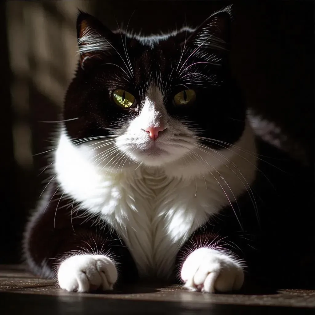 Hyper-realistic AI-generated portrait of Oreo, an 18-pound black-and-white feline overlord. Dramatic lighting highlights midnight-black fur, piercing yellow eyes, and muscular build. Cinematic mood with gothic undertones, intricate fur details, and a dim, shadowy backdrop. Perfect for AI-powered pet portraits, mystical animal art, or striking AI-generated imagery with a dark, mysterious atmosphere.