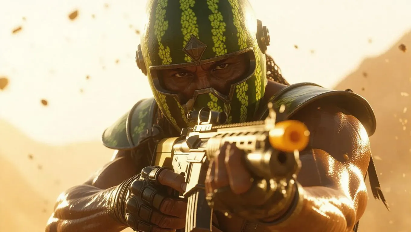 Generate a quirky AI warrior with a watermelon helmet, banana rifle, and lemon shield in a sunlit, battle-scarred landscape. Vivago.ai’s AI tools transform creative prompts into vivid, dynamic scenes with fruit weapons and detailed textures. Craft professional-grade visuals effortlessly.
