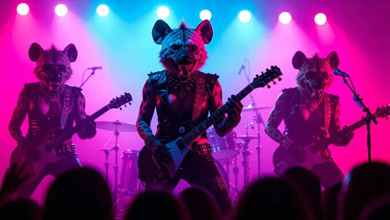 Vivid AI-generated visuals of a punk rock hyena band shredding on stage. Transform wild creativity into dynamic visuals with edgy AI effects, grungy textures, and electric stage presence. Perfect for music-themed art or album covers. Powered by vivago.ai – unleash bold, professional-grade AI imagery for rebellious, high-energy storytelling.