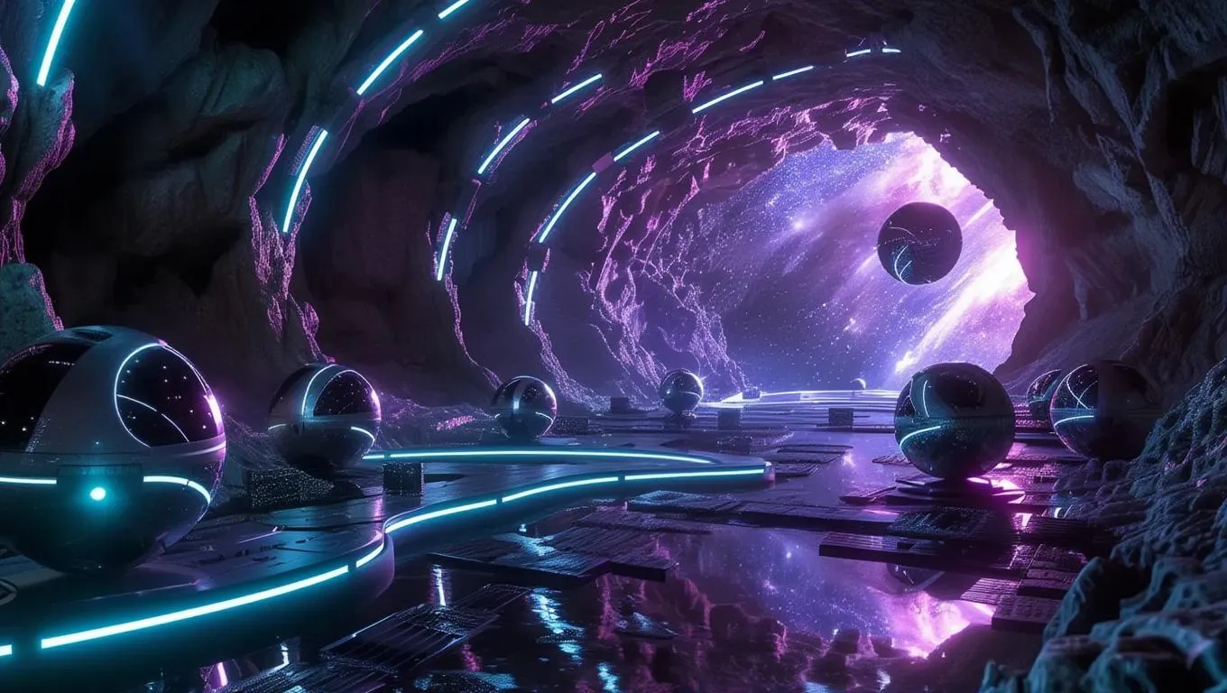 Generate vivid AI visuals of spherical droids and plate drones navigating a labyrinthine cave on an uncharted deep space planet. Craft dynamic sci-fi scenes with vivago.ai's text-to-image tools and AI effects for professional-grade, futuristic storytelling.