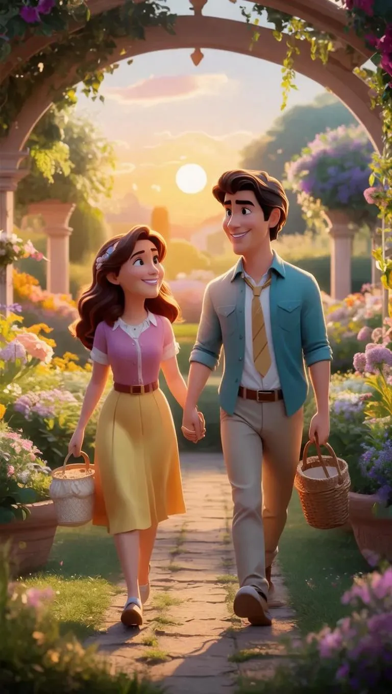 Create a Pixar-style romantic scene with AI: young high-society couple holding hands in a sunset-lit flower garden. Vivago.ai’s AI tools generate vibrant, whimsical animations blending dreamy textures, soft lighting, and playful animation details for enchanting, professional-grade visuals inspired by heartfelt storytelling.