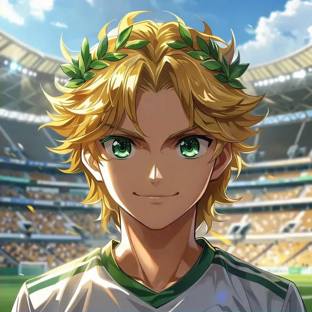 Generate a custom Inazuma Eleven male character with AI: long blonde hair, golden laurel crown, emerald eyes, and a warm smile. Create calm, friendly anime personas using vivago.ai's AI image tools. Perfect for fans seeking tall, serene characters with royal-inspired designs and approachable charm.