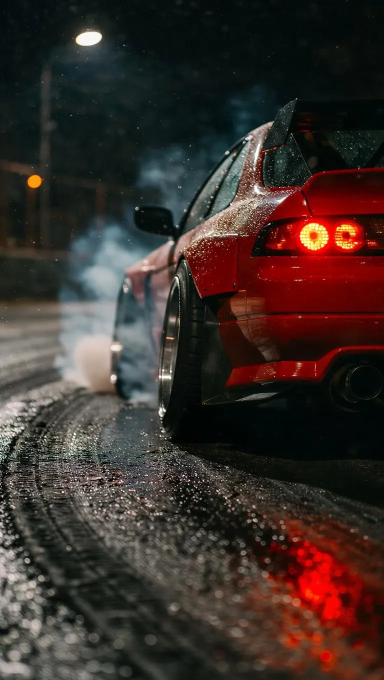 Capture high-octane JDM drifting action with AI-generated cinematic visuals. Experience a red Nissan 200SX S14's rear wheels in GoPro-style close-up, tire smoke, camber, night industrial lighting. Perfect for motorsport enthusiasts seeking dynamic, professional-grade AI video effects.