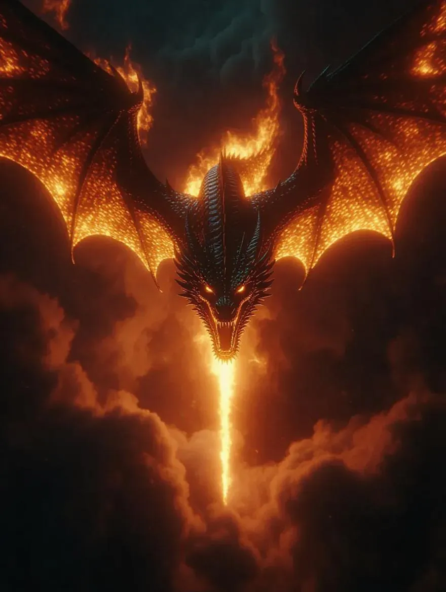 Generate a cinematic AI image of an epic fire dragon bursting through a dimensional rift in stormy night skies, featuring glowing eyes, fiery wings, and swirling dark clouds. Perfect for dark fantasy visuals, book covers, or concept art with professional-grade AI effects for dramatic supernatural creature designs.