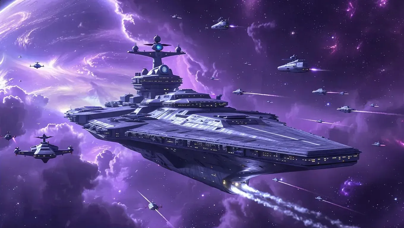 Witness AI-crafted space armada art: Earth's flagship carriers and drone ships surge through a purple nebula at ultra-fast speeds. Experience intricate sci-fi details in this peaceful, elegant masterpiece with vivago.ai's AI tools for stunning visuals and nebula effects.