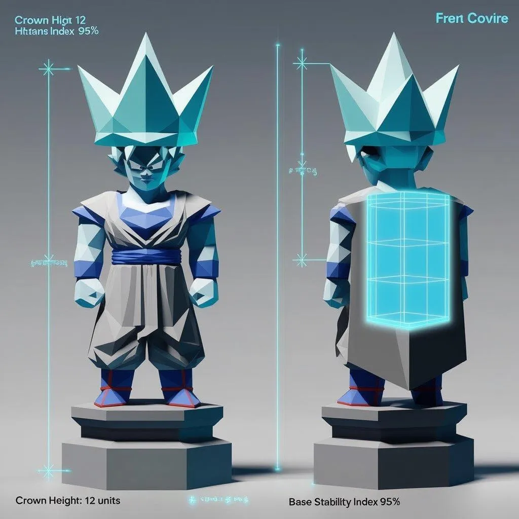 AI-generated 3D printable low-poly chess king Goku statue blueprints with orthographic views, cyan wireframes, and weathered marble textures. Technical design features geometric crowns, hollow structures, bronze accents, and measurement annotations for precision modeling. Ideal for anime-inspired chess sets and 3D printing enthusiasts.