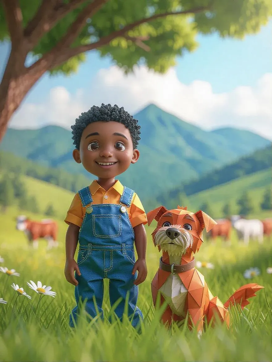 A young African boy with a bright smile and worn denim overalls, accompanied by his loyal dog, a scruffy terrier mix with a wagging tail, standing together in a lush green valley surrounded by rolling hills and towering trees, watching a herd of cattle graze peacefully in the distance. The scene is crafted from intricately folded origami paper, with delicate papercraft details and textures, reminiscent of traditional Japanese stationery, with a soft focus effect, as if viewed through a warm, sunny haze, in 8K resolution, 64 megapixels, with the dreamy quality of a nostalgic photograph, blending the aesthetics of Hayao Miyazaki's whimsical landscapes, the playfulness of Quentin Blake's illustrations, and the intricate paper art of Peter Callesen.