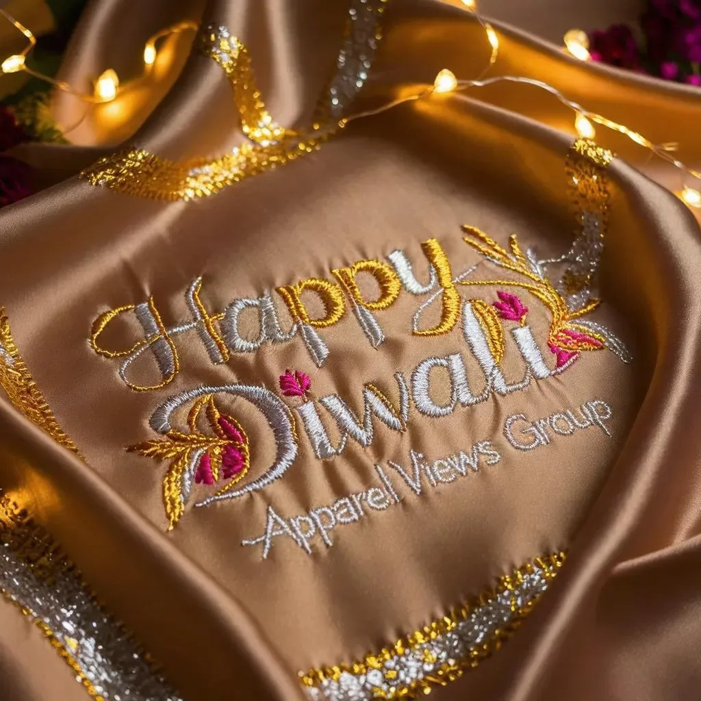 Create a festive Happy Diwali greeting with custom embroidery on premium fabric by Apparel Views Group. AI-enhanced designs merge traditional motifs with modern elegance, perfect for personalized corporate gifting, branded celebrations, and professional festive branding. Elevate your Diwali wishes with intricate, AI-crafted embroidery.